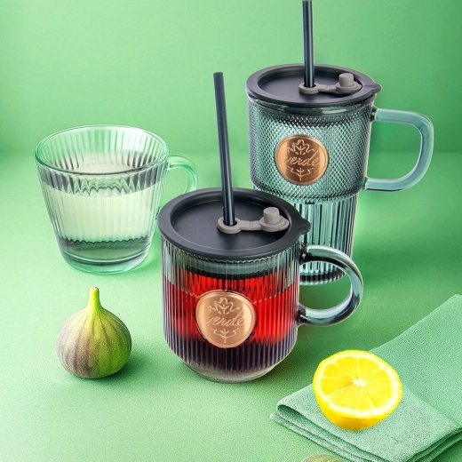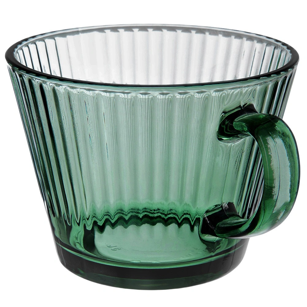 Cană elegantă din sticlă din colecția VERDE, în variantă verde transparentă, ce oferă o combinație excelentă de stil și practicitate. Striațiile verticale adaugă un aspect modern și, în același timp, îmbunătățesc siguranța prinderii. Datorită volumului de 420 ml, servești cu ușurință o cafea mare, ceai sau băuturile reci preferate.
