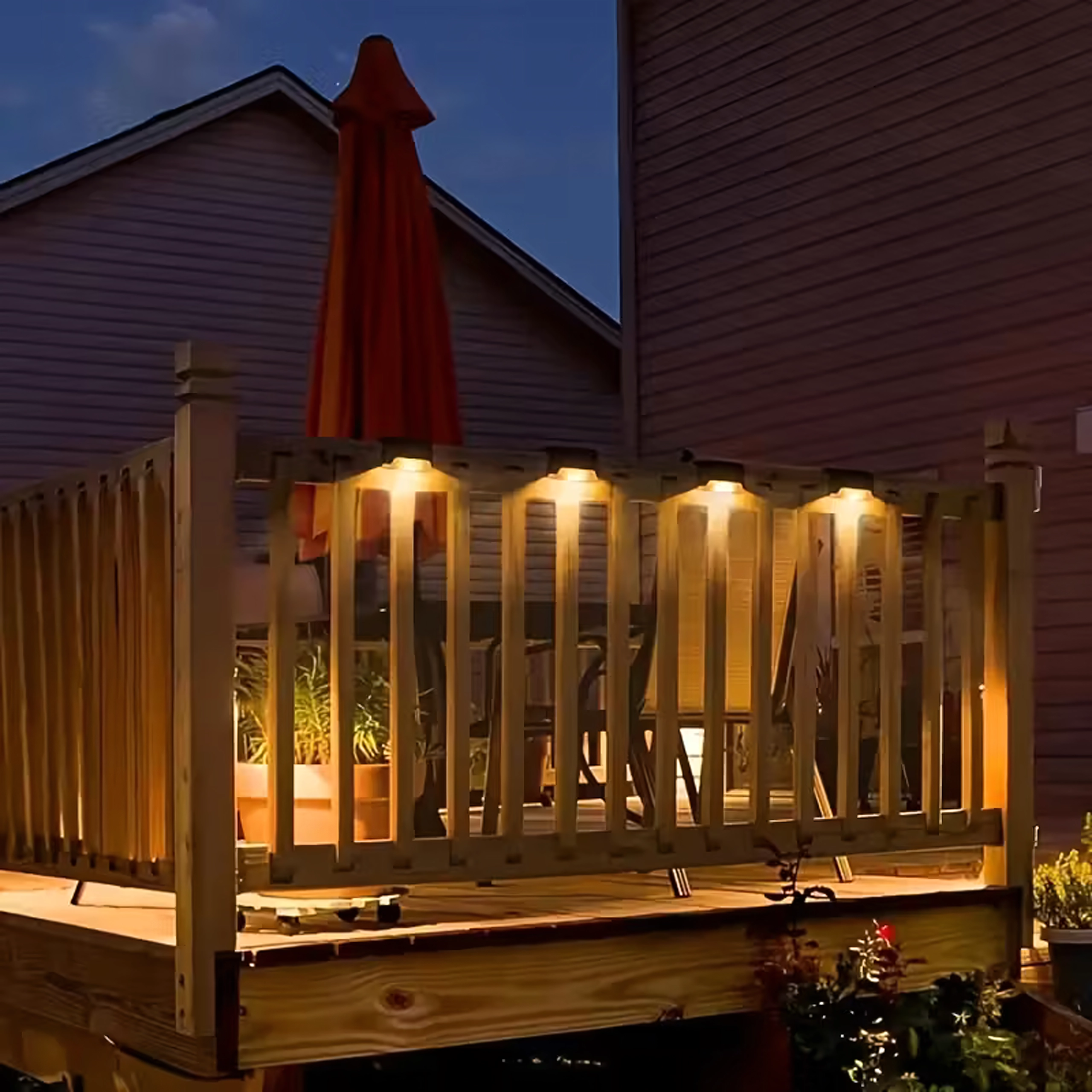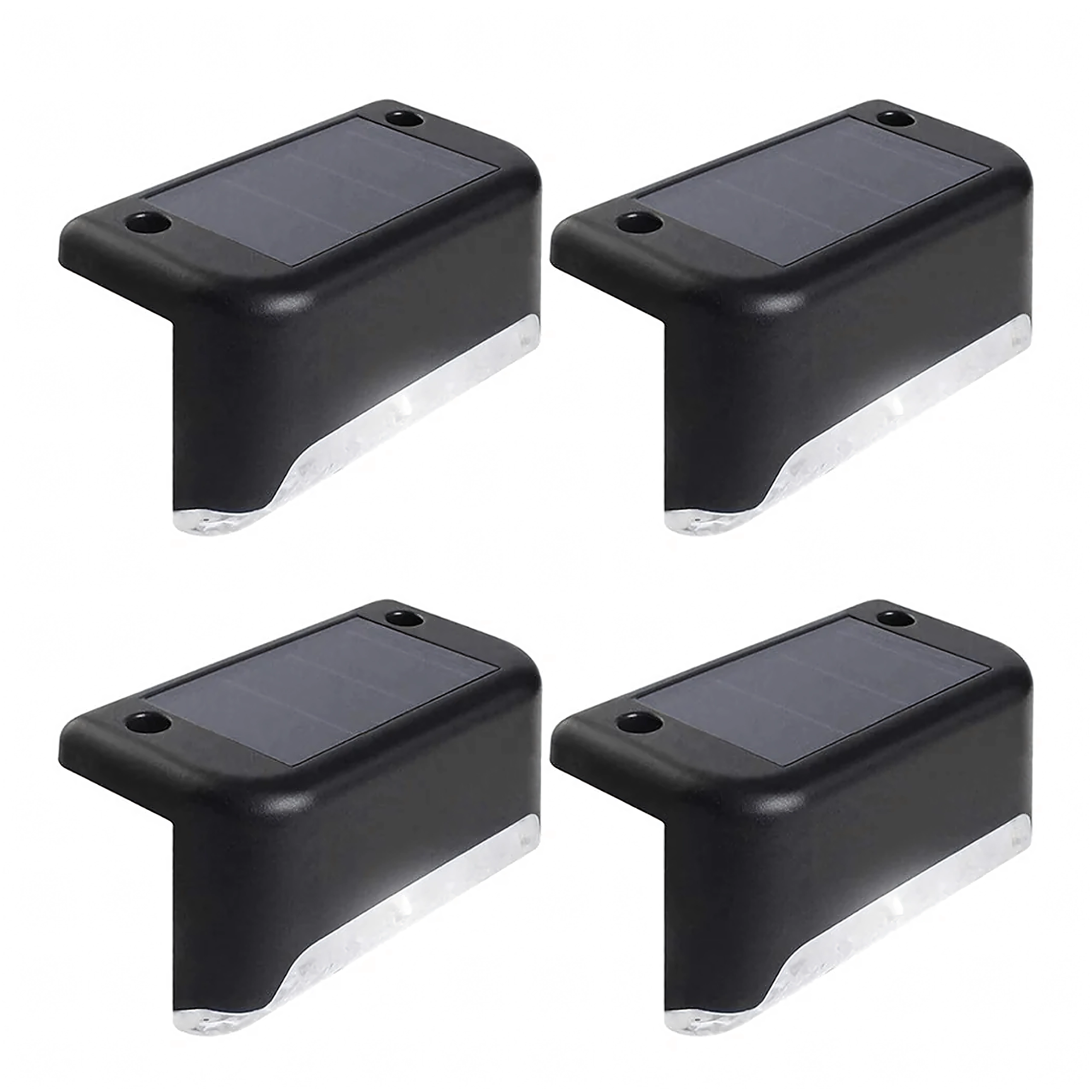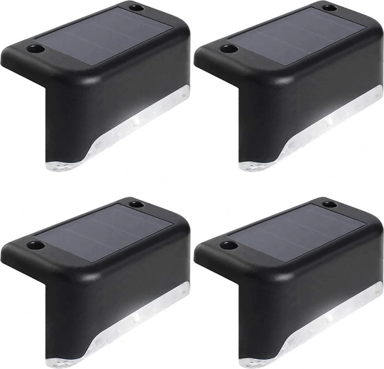 Set practic de 4 lămpi solare de exterior pentru iluminarea în siguranță a treptelor, teraselor și balustradelor. Aprindere automată la amurg, LED economice, lumină caldă și plăcută și construcție rezistentă la apă pentru funcționare pe tot parcursul anului, fără cabluri.