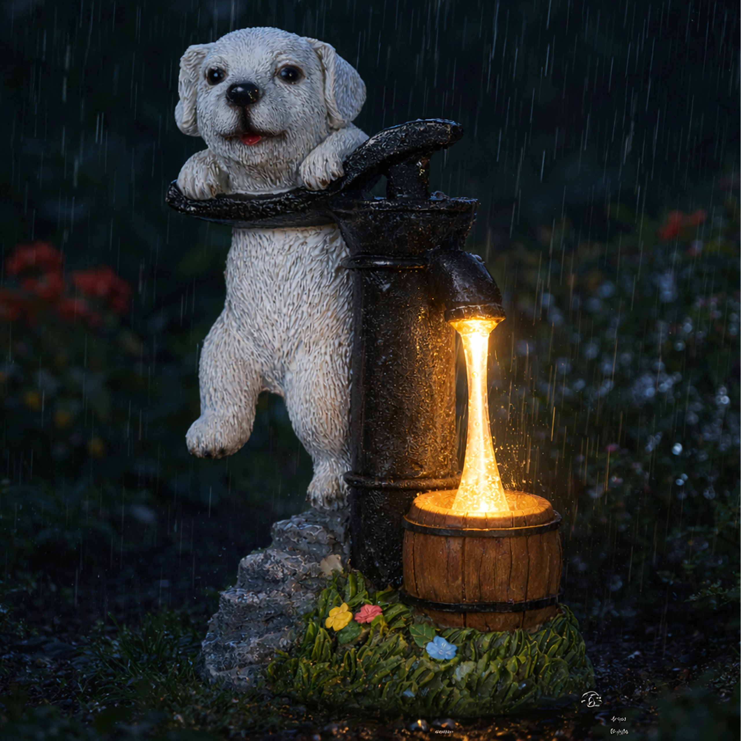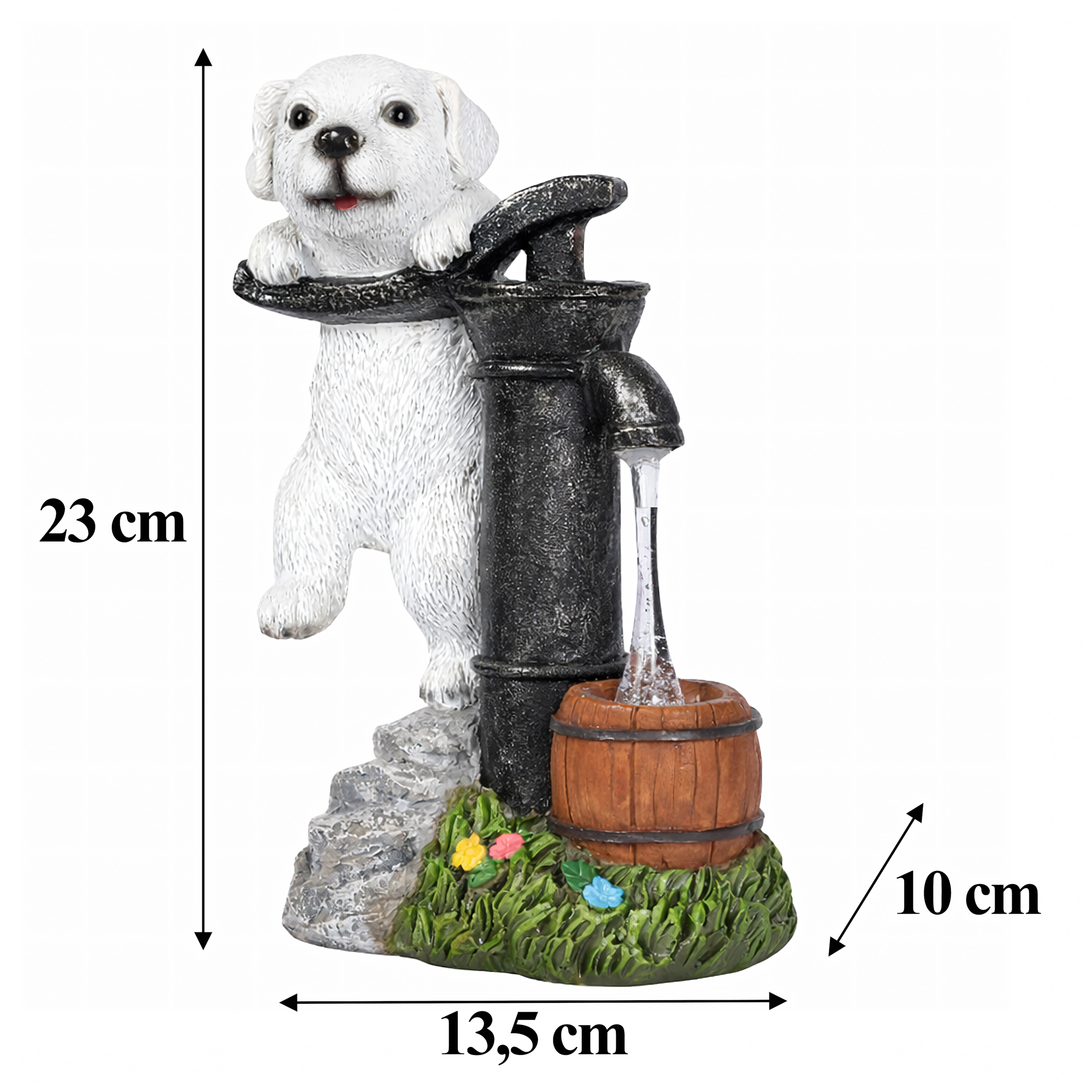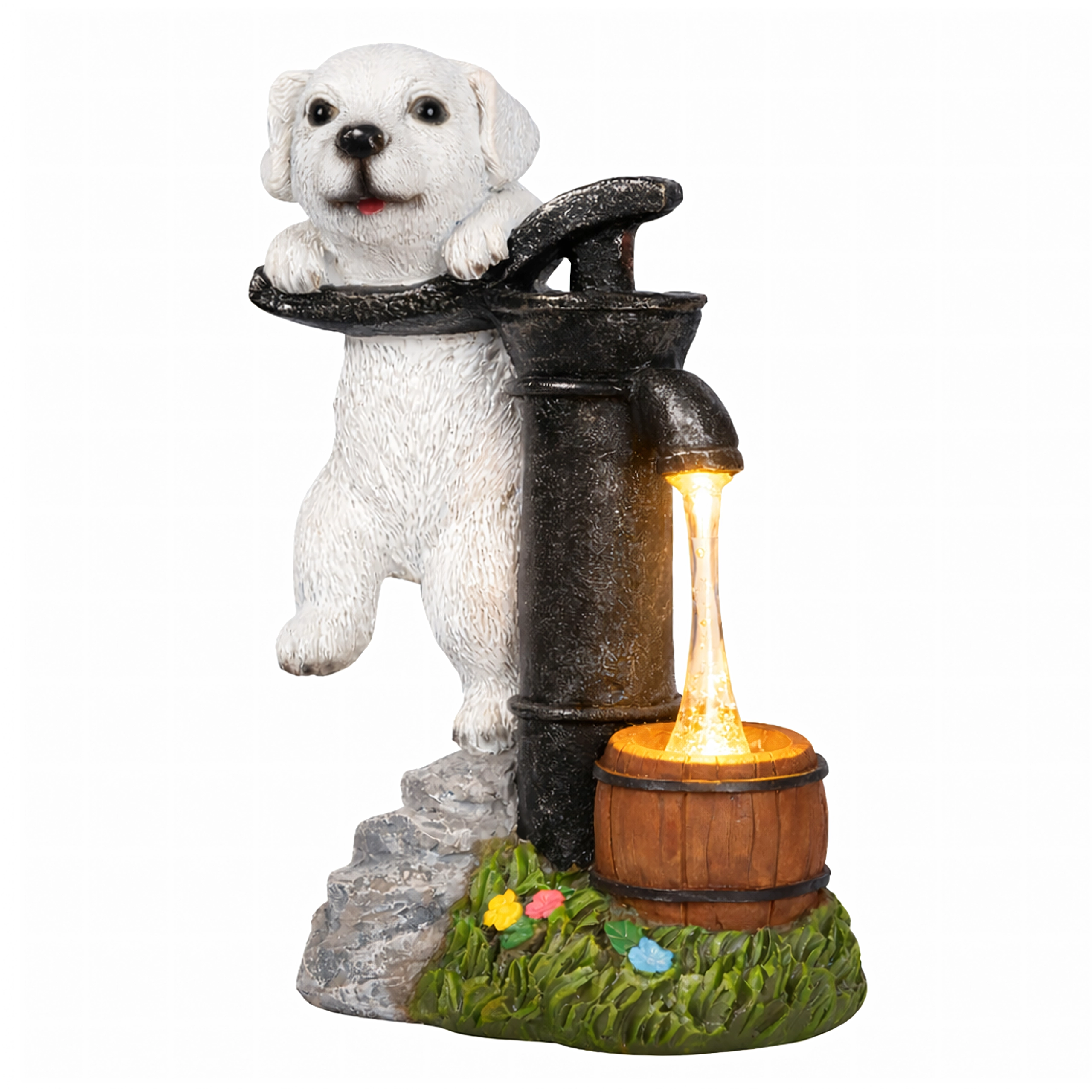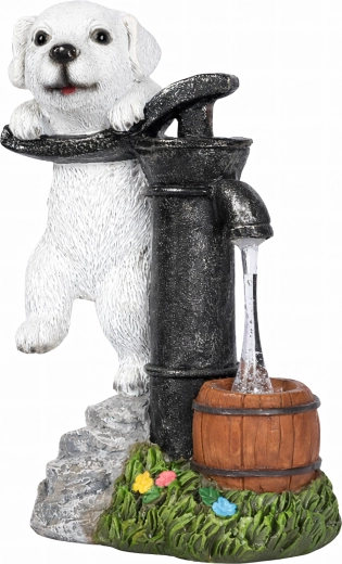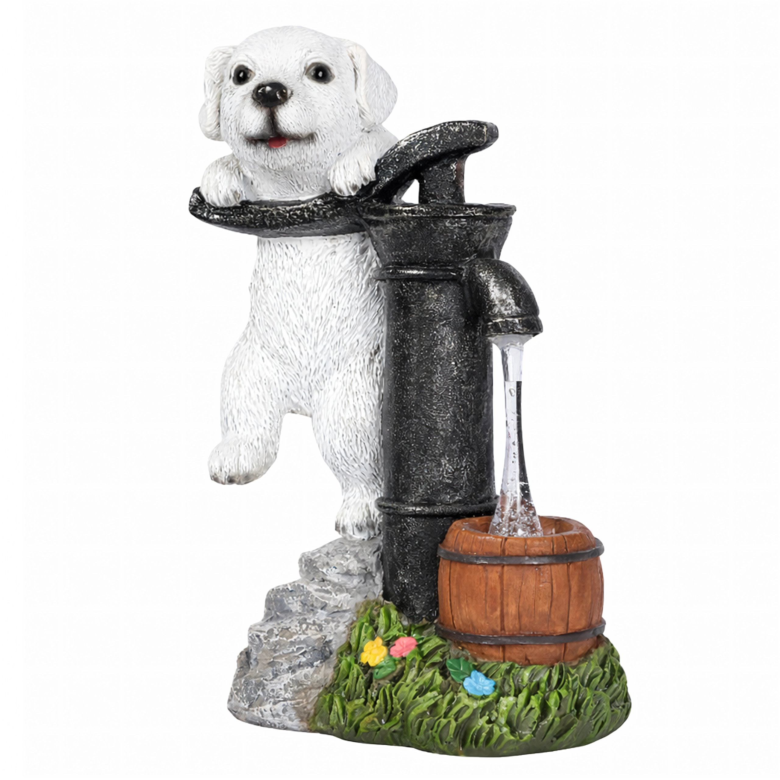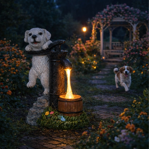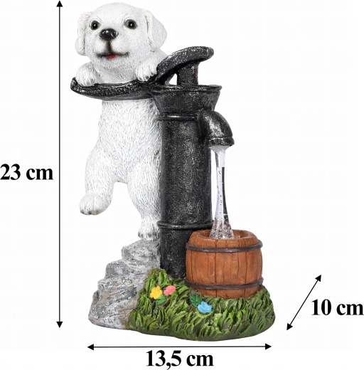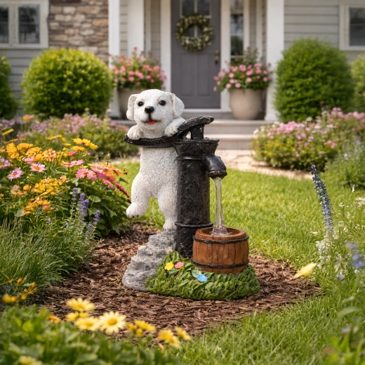 Figurina realistă a cățelușului lângă o pompă veche, cu butoiaș de lemn și texturi de piatră și iarbă, se potrivește de-a lungul aleilor, lângă straturi și pe terasă.