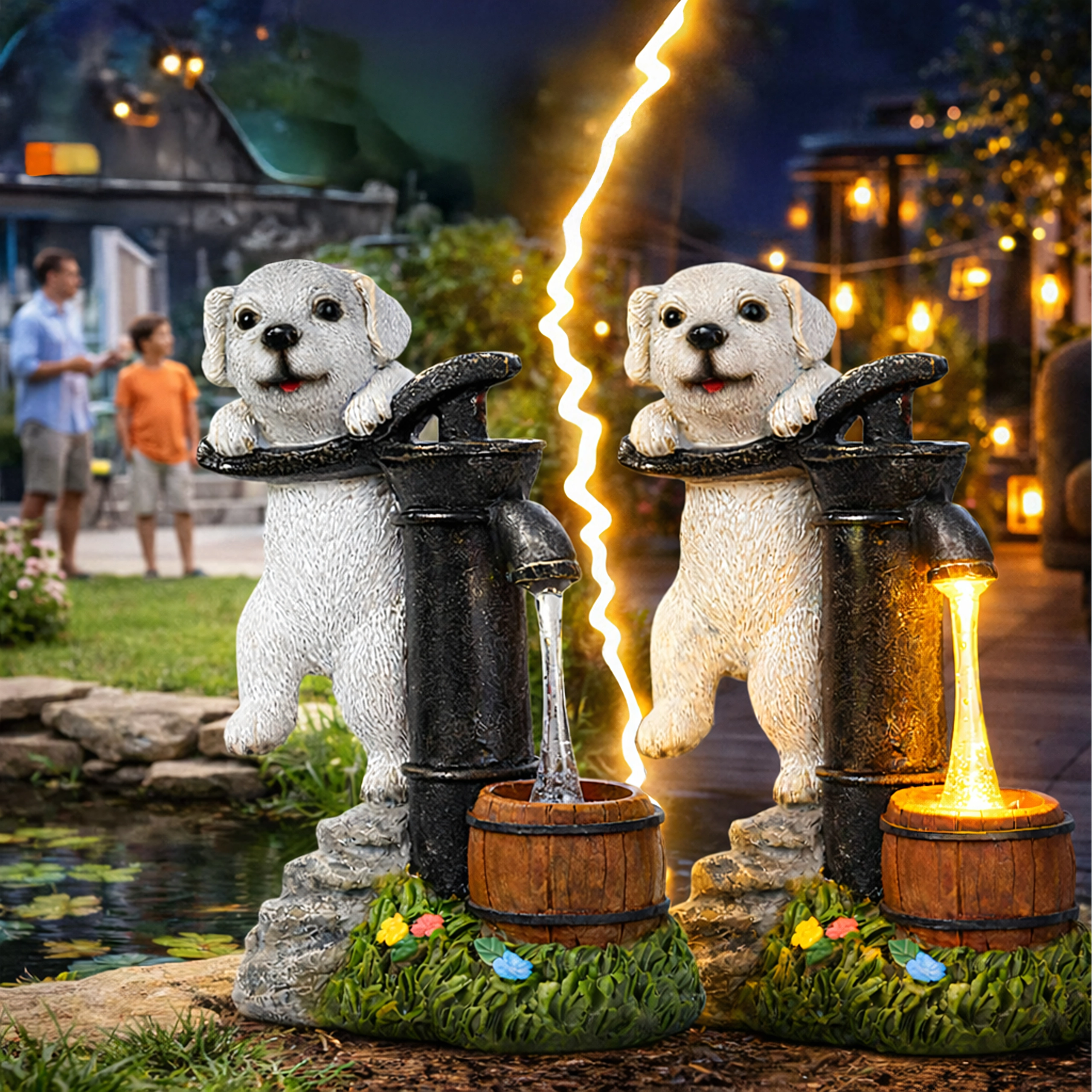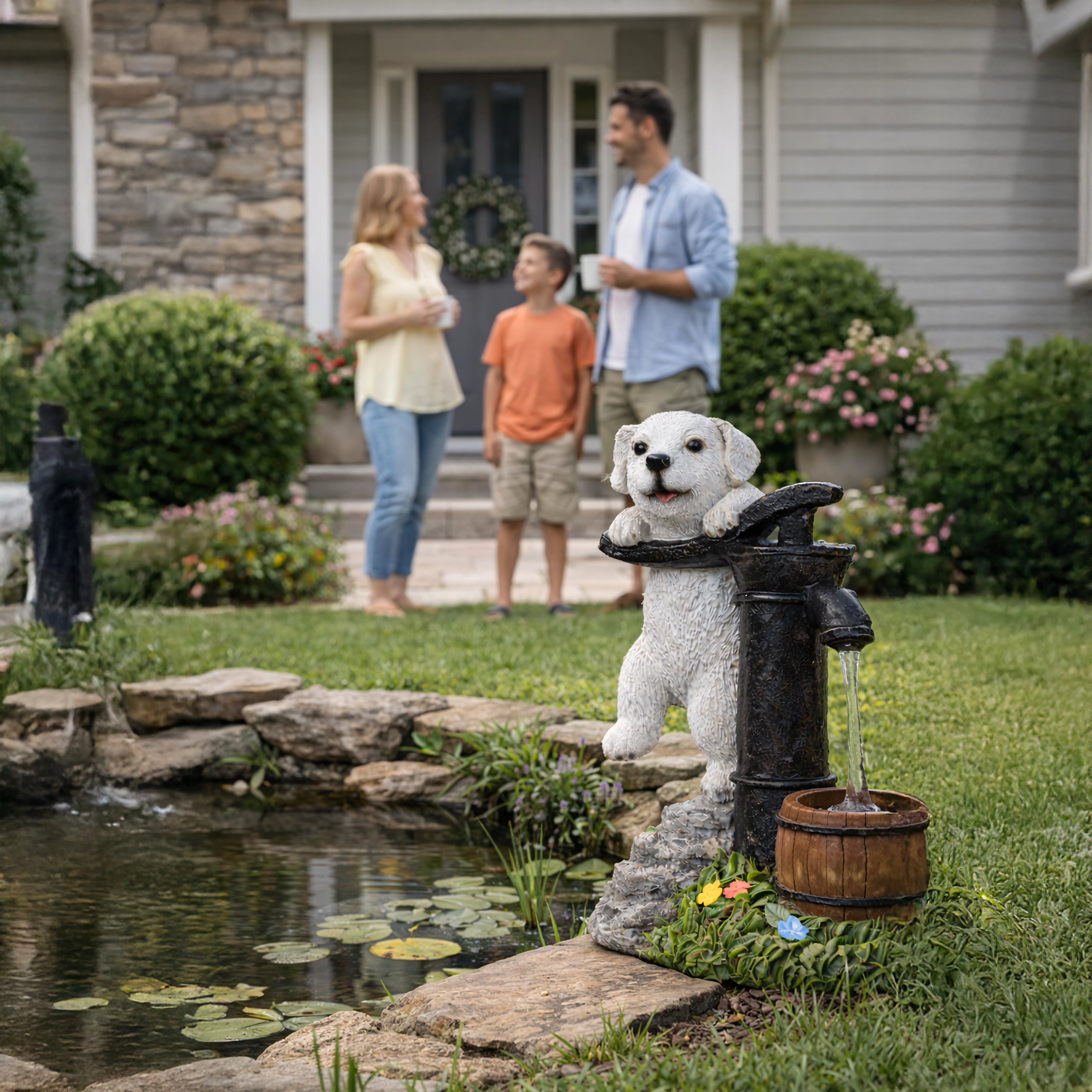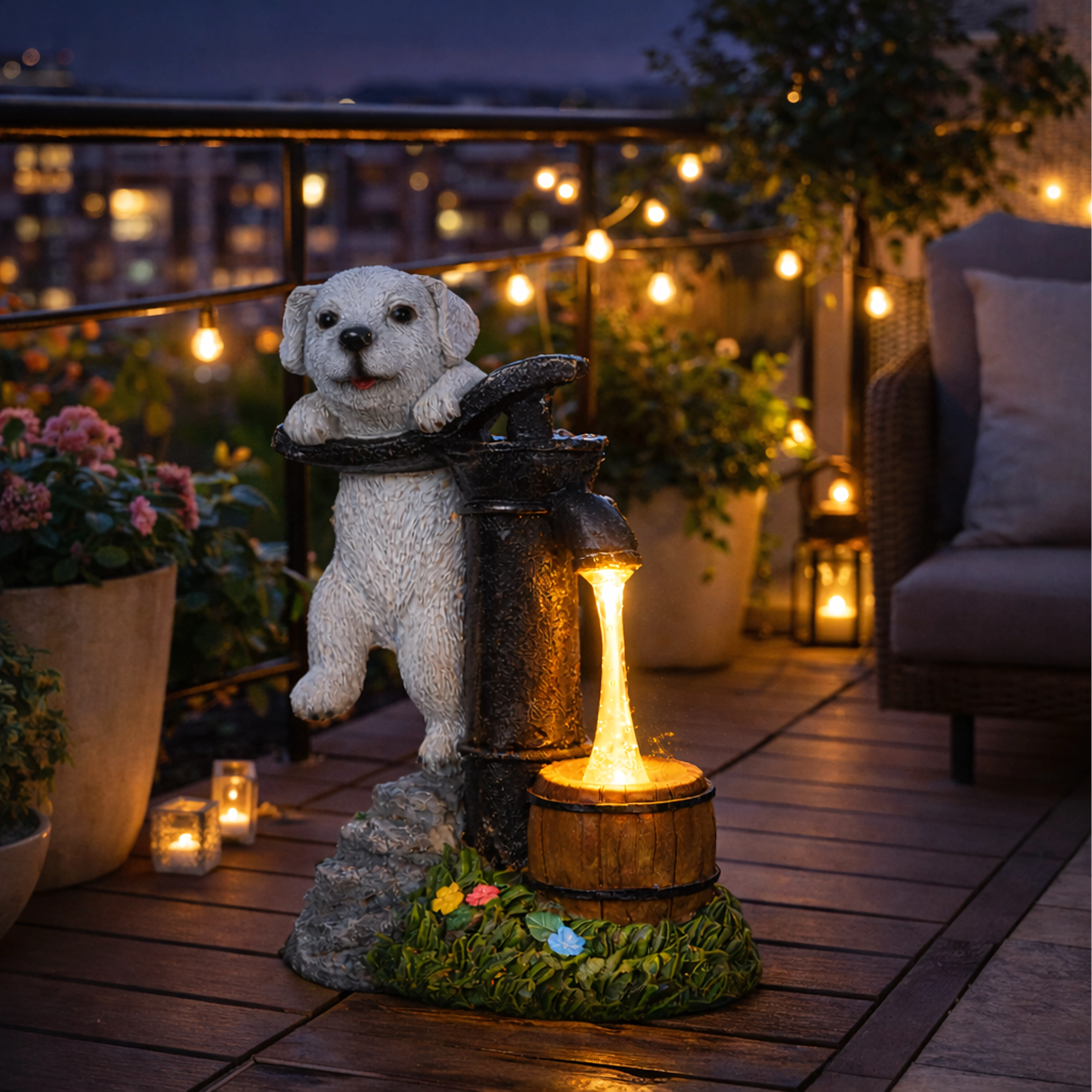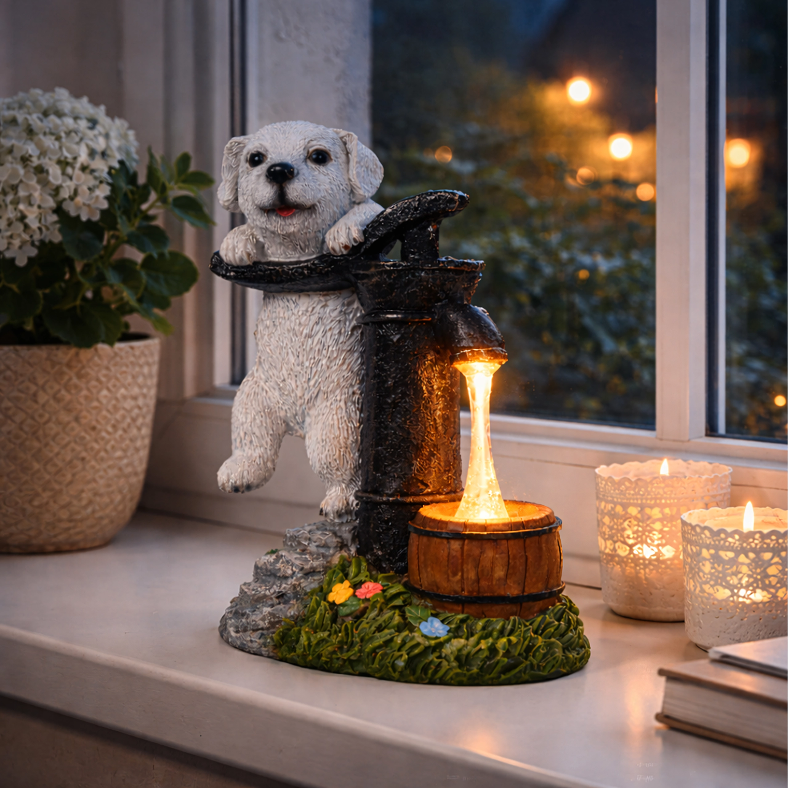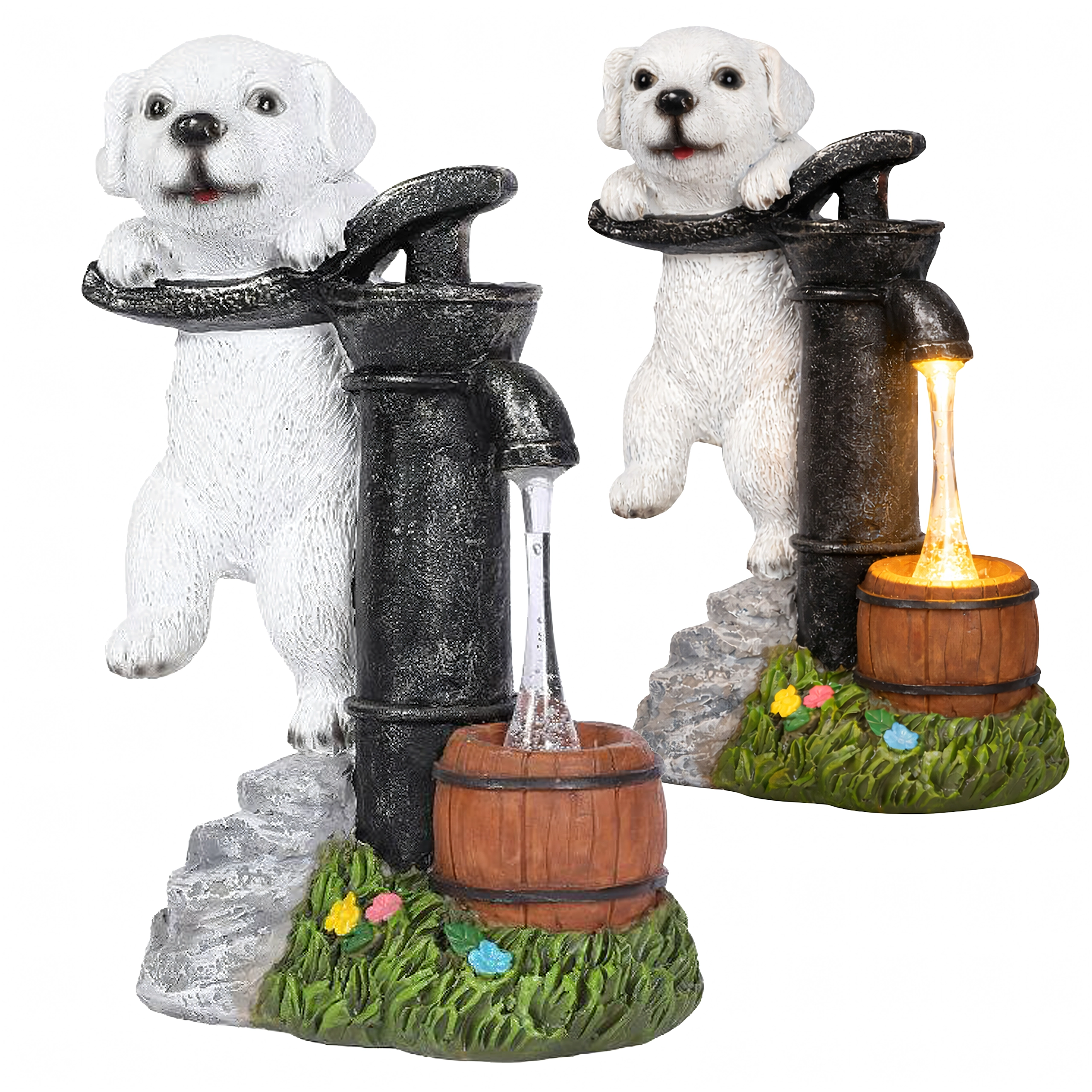 Figurina realistă a cățelușului lângă o pompă veche, cu butoiaș de lemn și texturi de piatră și iarbă, se potrivește de-a lungul aleilor, lângă straturi și pe terasă.