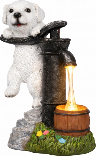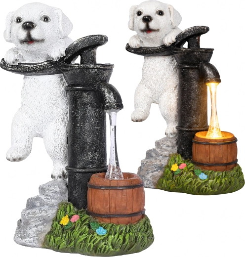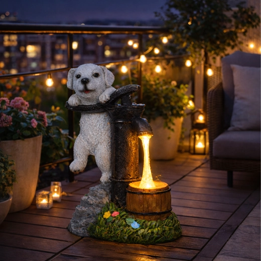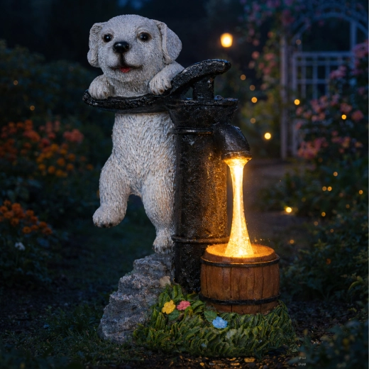 Decorațiunea de grădină, elegantă, îmbină farmecul unui cățeluș sprijinit de o pompă manuală vintage cu iluminare LED practică. Lumina caldă creează efectul unui fir de apă care curge într-un mic butoiaș de lemn, astfel încât spațiul tău exterior capătă seara o iluminare ambientală plăcută, fără instalare complicată.