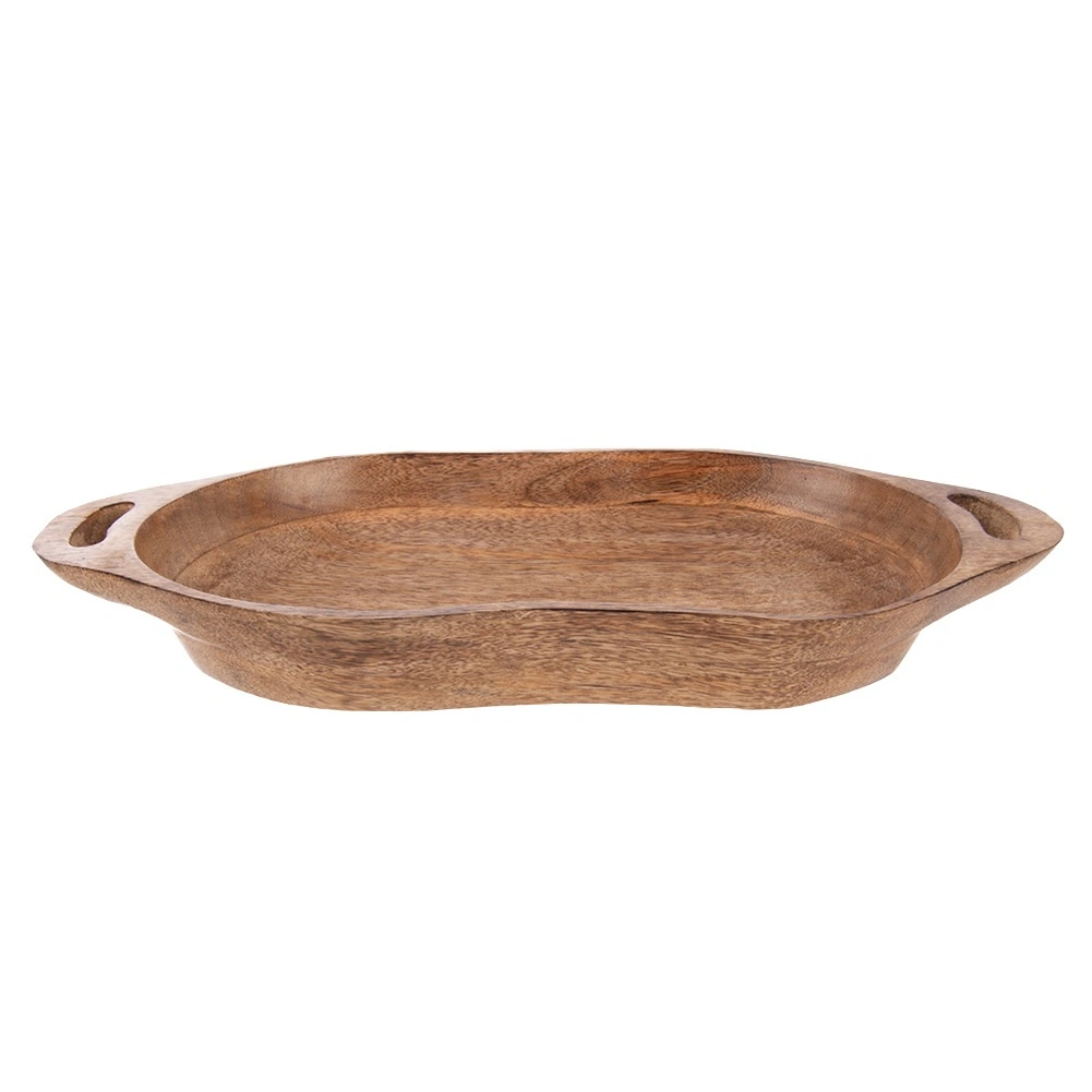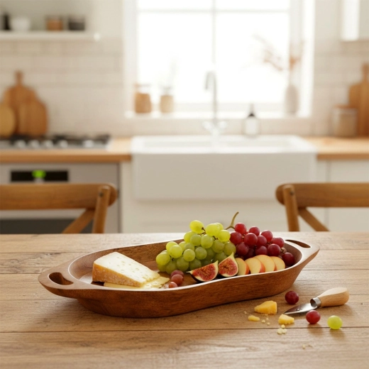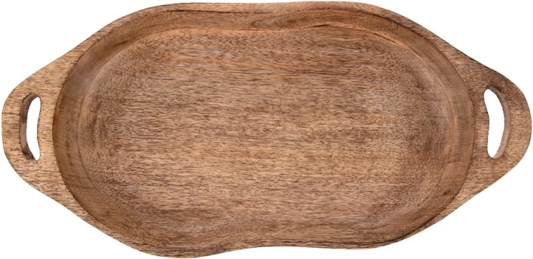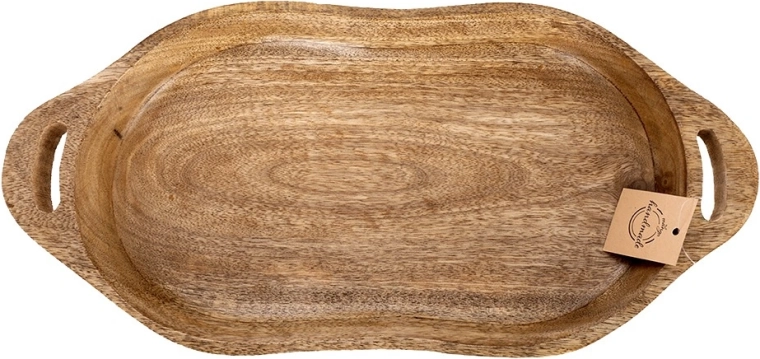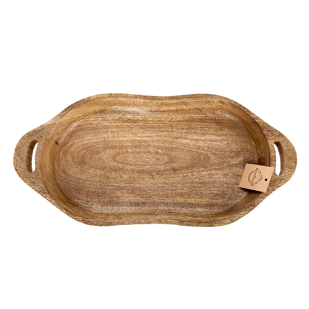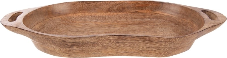 Elegantă tavă de servire din lemn de mango cu mânere integrate pentru transport ușor și servire în siguranță. Datorită fibrei naturale a lemnului și marginii înălțate, este ideală pentru brânzeturi, fructe, deserturi și gustări, dar și ca decorațiune stilată pentru bucătărie sau living.