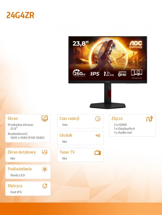 Monitorul de gaming AOC de 23,8" oferă o imagine extrem de fluidă datorită ratei de reîmprospătare de 240 Hz și timpului de răspuns rapid al panoului Fast IPS. Vei aprecia cursivitatea ridicată și estomparea minimă a mișcării în jocuri FPS, de curse și de acțiune.