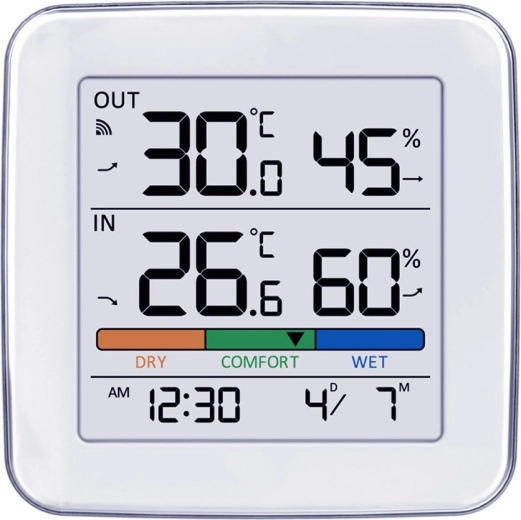 GREENBLUE GB169 este o stație meteo compactă și stilată pentru controlul zilnic al climatului. Pe ecranul mare afișează simultan temperatura interioară și exterioară, umiditatea, ora și data, completate de indicatorul color de confort (Dry/Comfort/Wet) pentru evaluarea rapidă a mediului.
