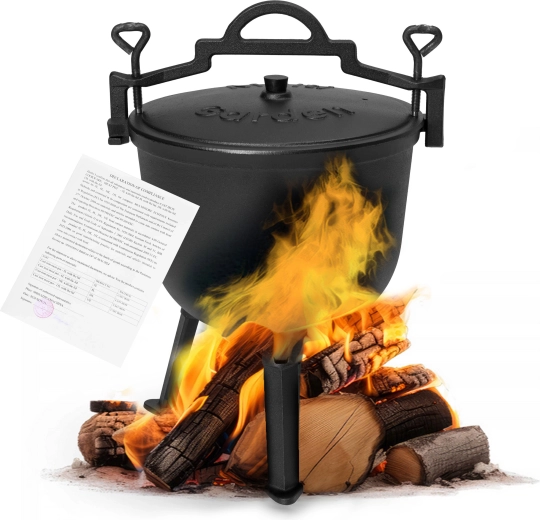 Ceaun robust din fontă, cu volum de 10 l, ideal pentru gătit în aer liber la foc, camping și petreceri în grădină. Datorită fontei, distribuie uniform căldura pentru înăbușire lentă, fierbere și coacere. Include capac, suport stabil și mâner practic pentru transport în siguranță. Picioarele detașabile facilitează transportul și, după demontare, permit folosirea ceaunului și pe aragazul pe gaz.