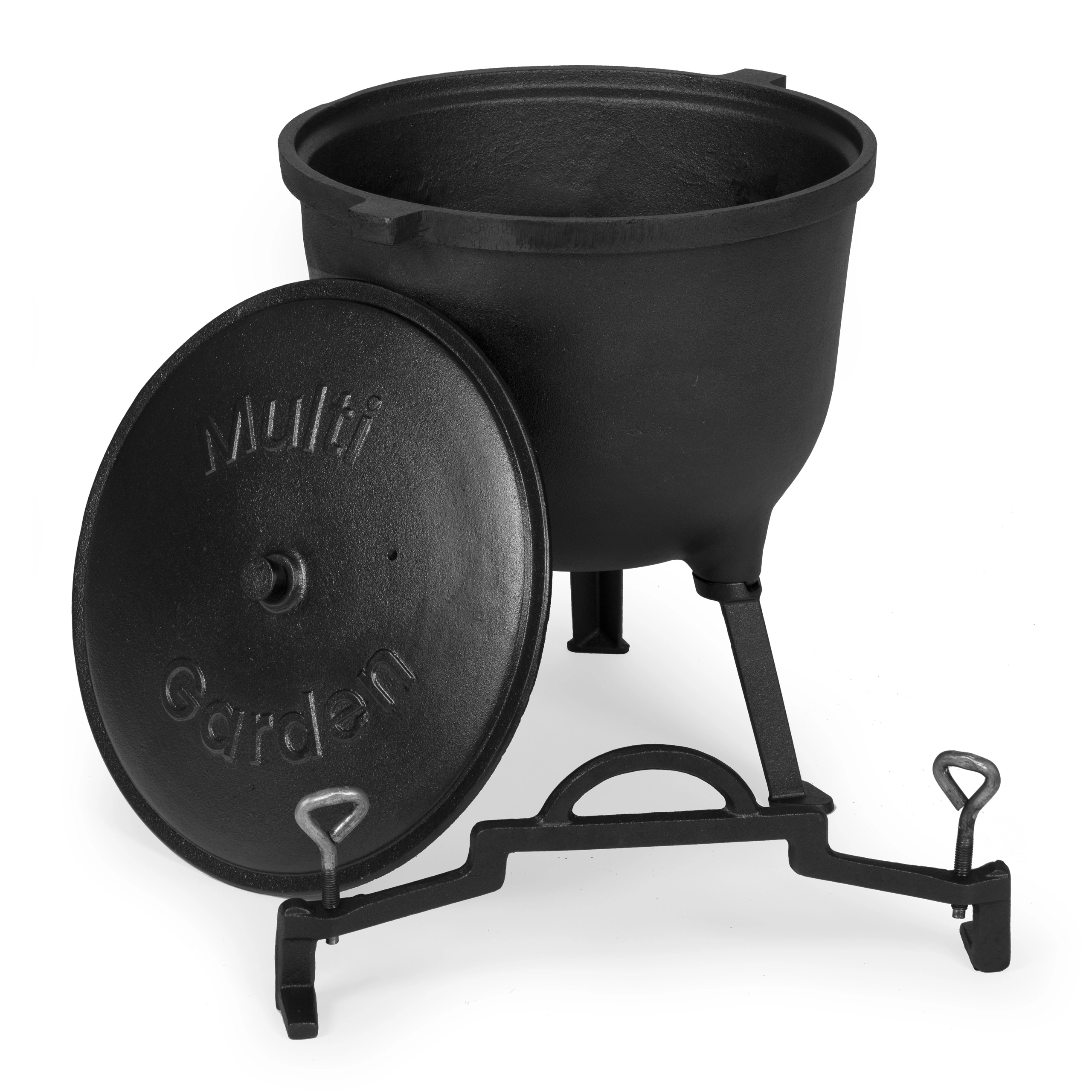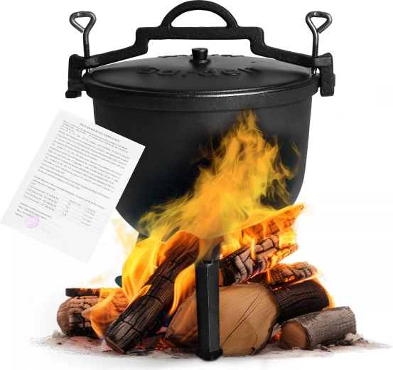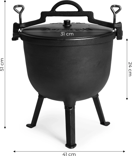 Ceaun robust din fontă cu volum de 15 l este ideal pentru gătit la foc deschis, întâlniri în grădină și camping. Datorită fontei, acumulează și distribuie uniform căldura, fiind potrivit pentru gulașuri lente, supe și fripturi. Include capac, suport și toartă practică pentru transport în siguranță. Picioarele detașabile facilitează transportul și, după demontare, permit utilizarea și pe aragazul pe gaz.