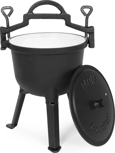 Bucurați-vă de gătitul autentic pe foc deschis cu ceaunul din fontă MULTIGARDEN. Construcția masivă rezistă la temperaturi foarte ridicate, suprafața emailată din interior este netedă și igienică și nu necesită ardere sau pre-sezonare. Ideal pentru gulașuri, supe, raguuri și gătire lentă a cărnii – afară sau în casă.