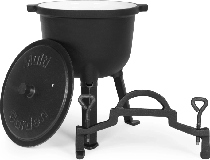 Ceaun robust din fontă cu volum de 8 l, cu suport MULTIGARDEN, ideal pentru gătit în grădină, la foc de tabără sau în camping. Datorită interiorului emailat se curăță ușor, fonta distribuie excelent căldura și asigură înăbușire, fierbere și coacere uniforme. Ceaunul are picioare detașabile pentru transport comod, mâner sigur pentru transport și capac cu orificiu de ventilație pentru un control mai bun al gătirii.