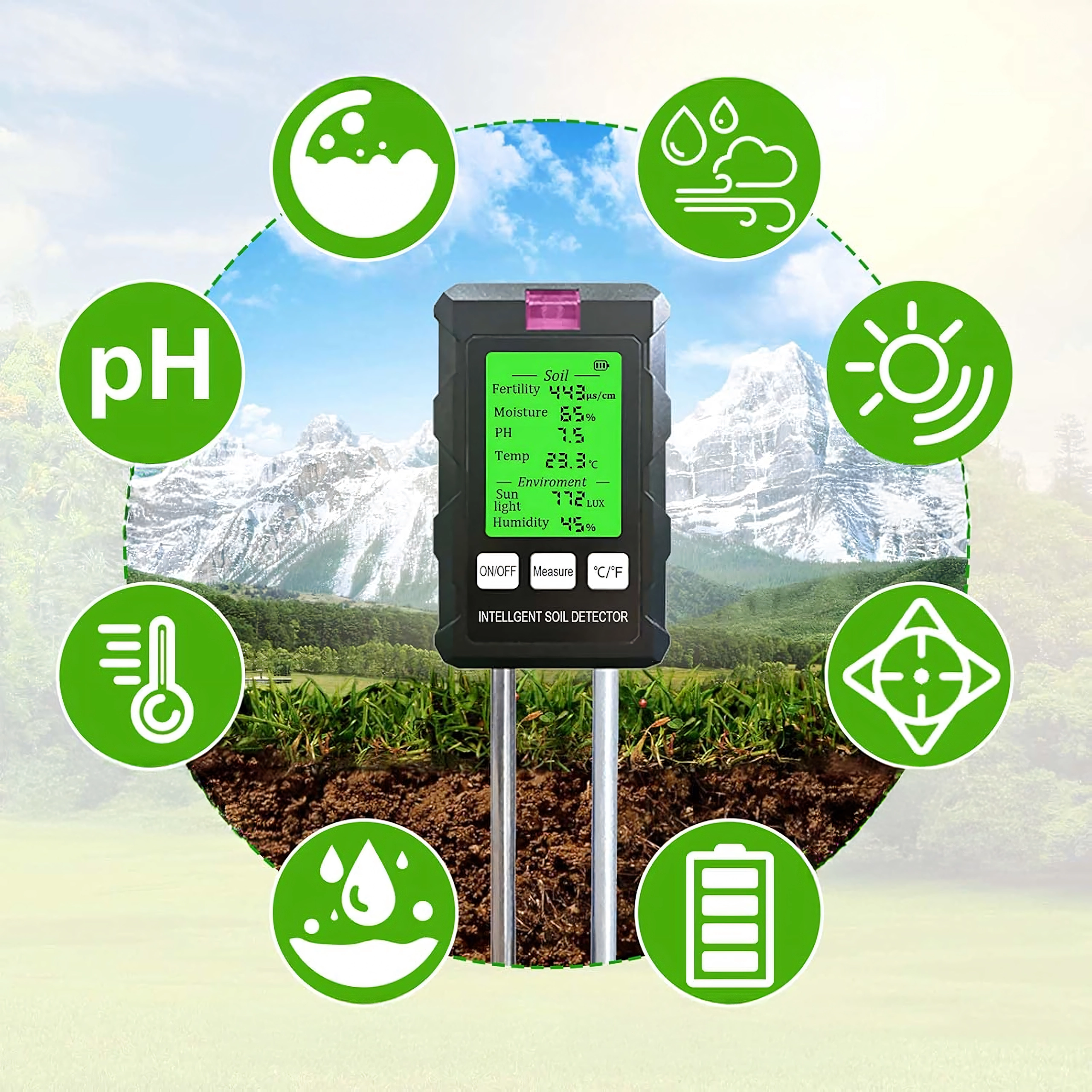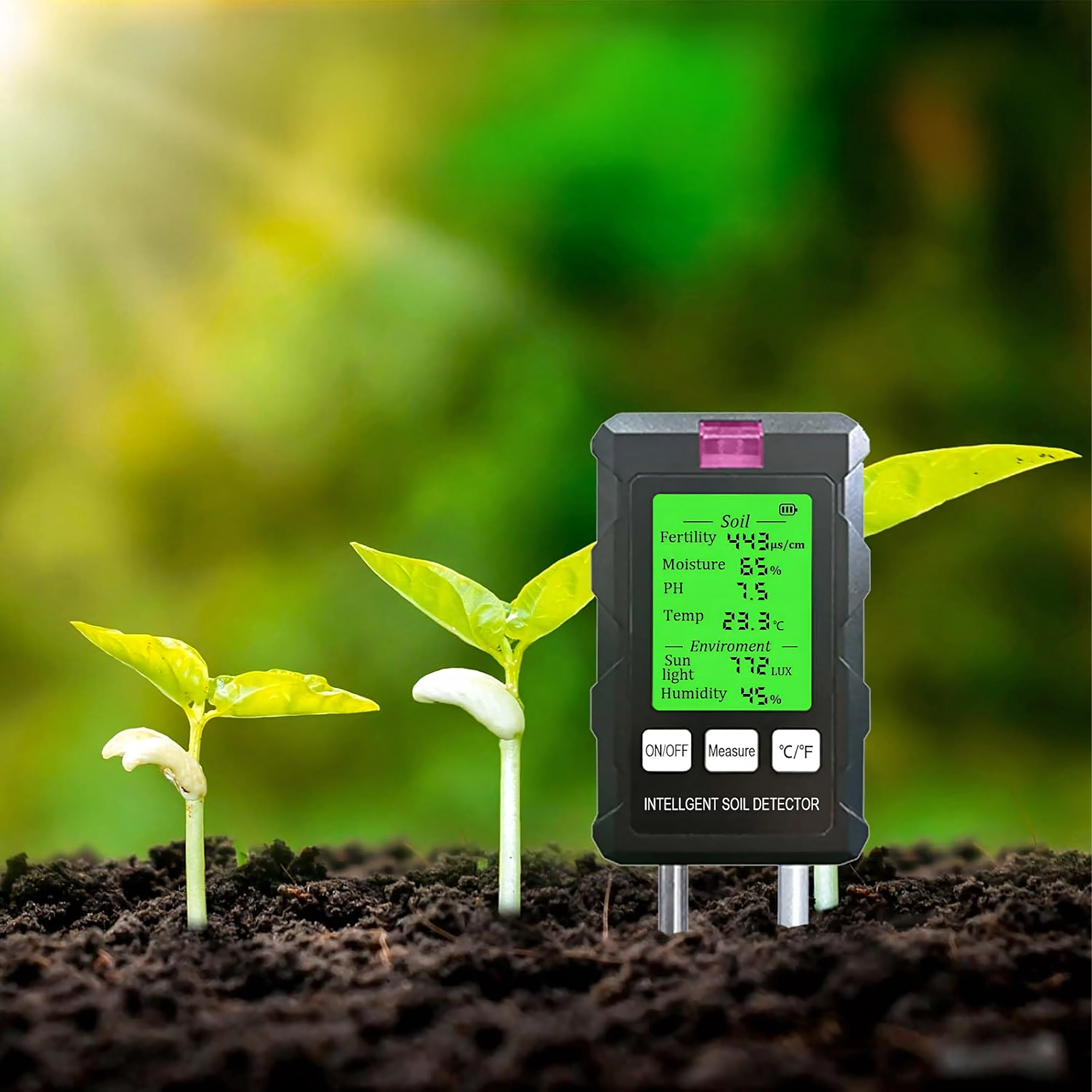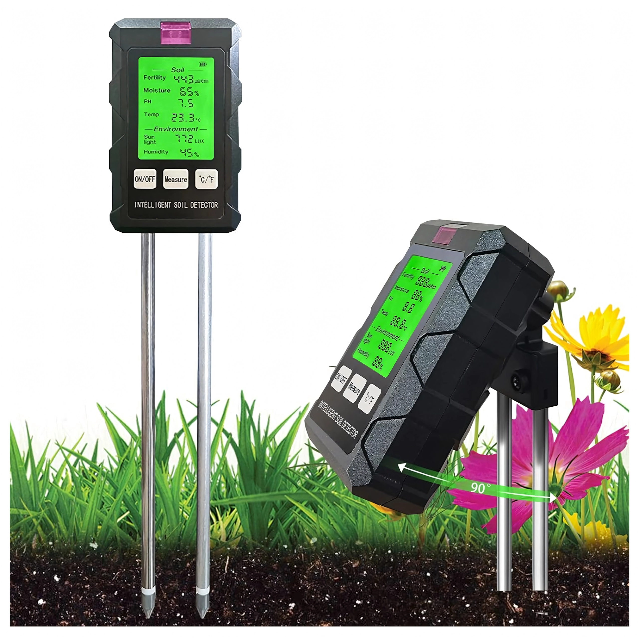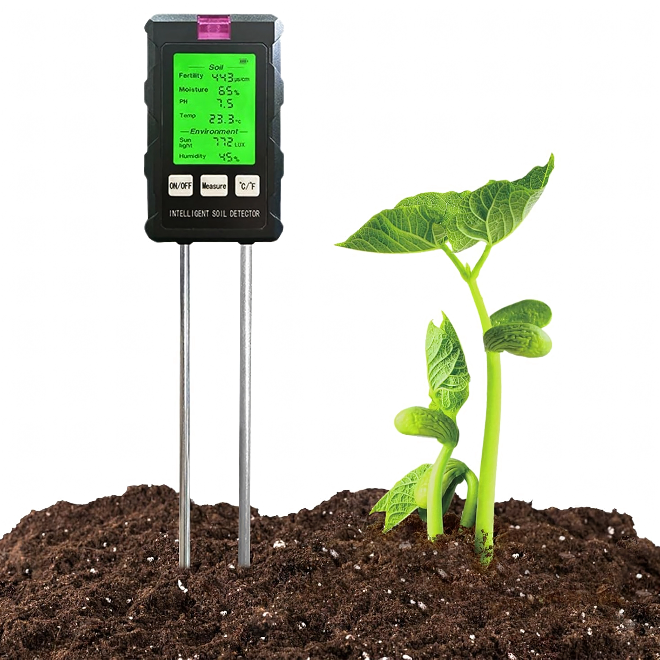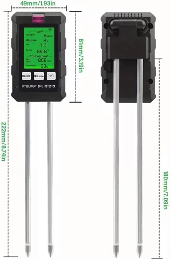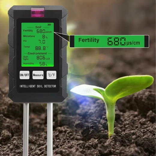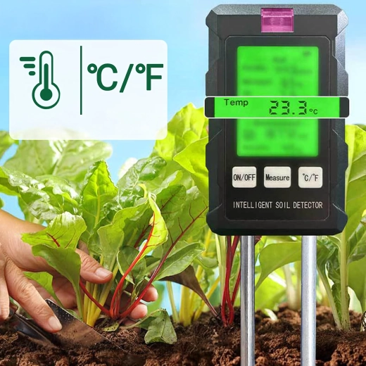 Măsoară pH-ul, umiditatea și temperatura solului, fertilitatea (nutrienții), intensitatea luminii și umiditatea aerului – toate pe un singur ecran cu iluminare din spate pentru decizii rapide în îngrijirea plantelor.