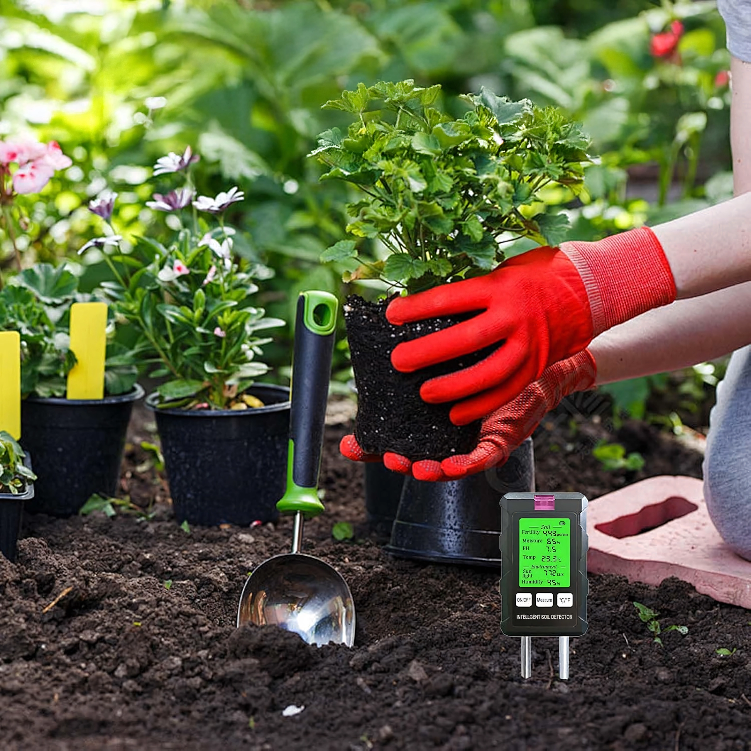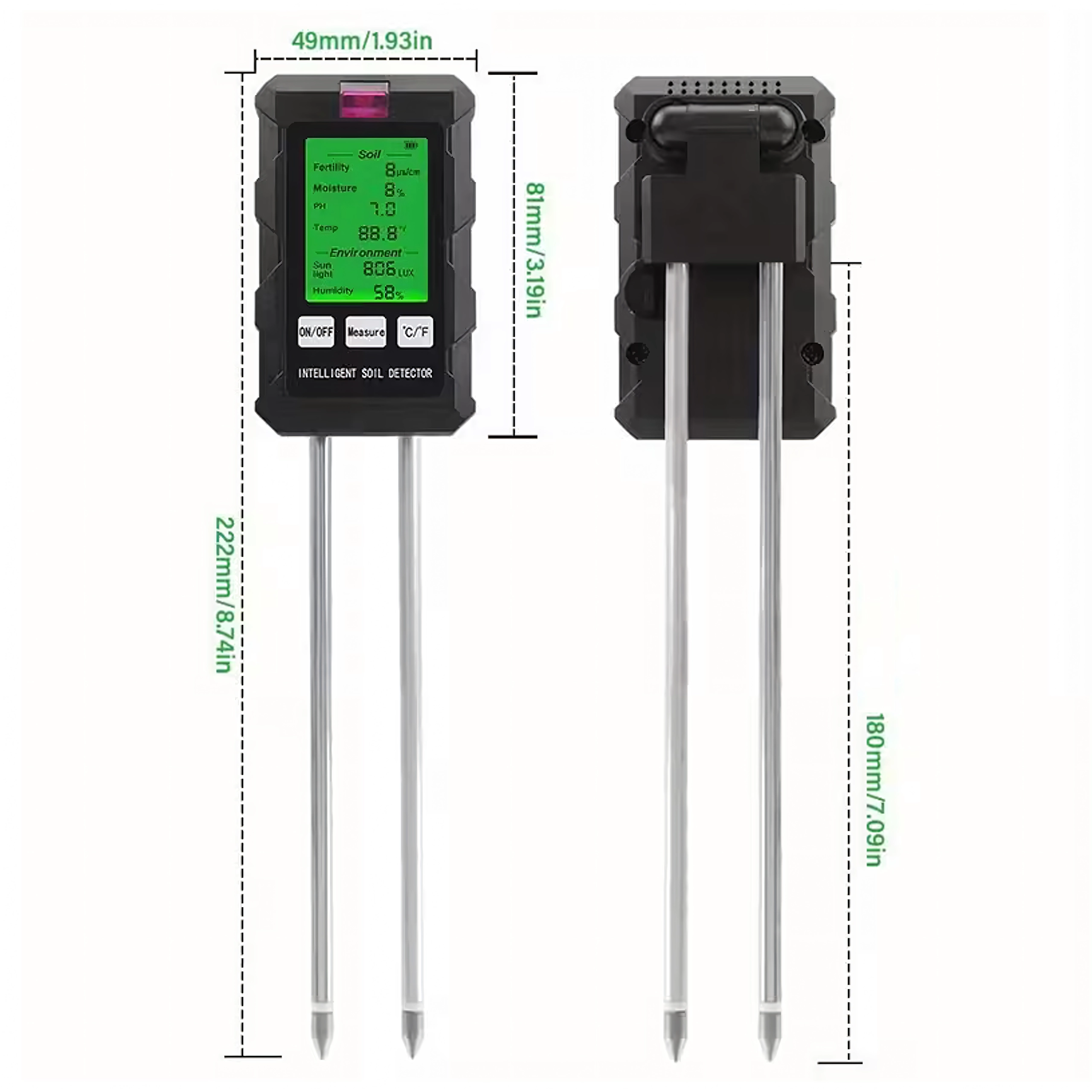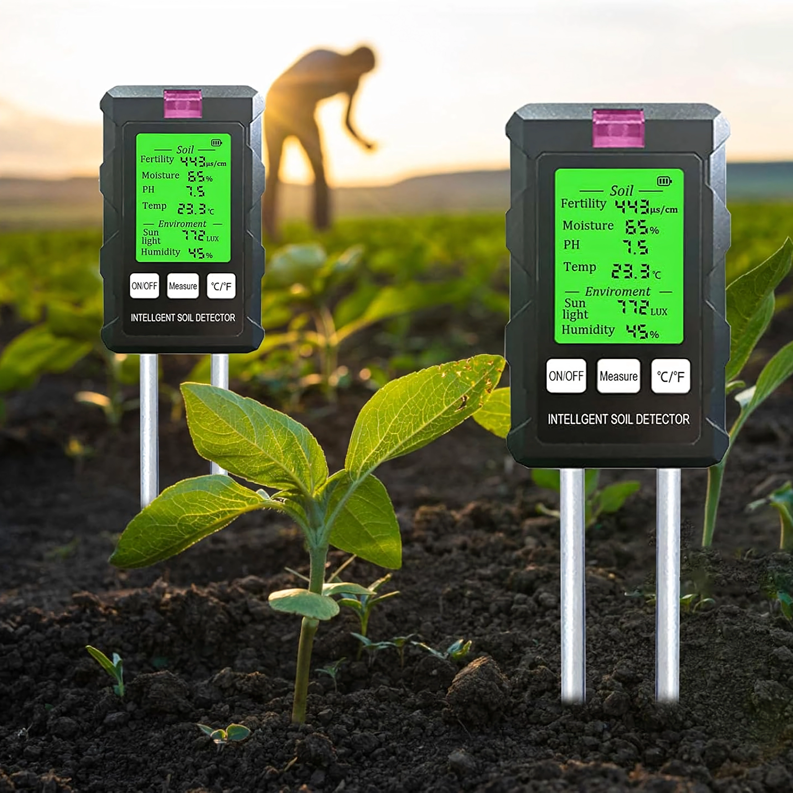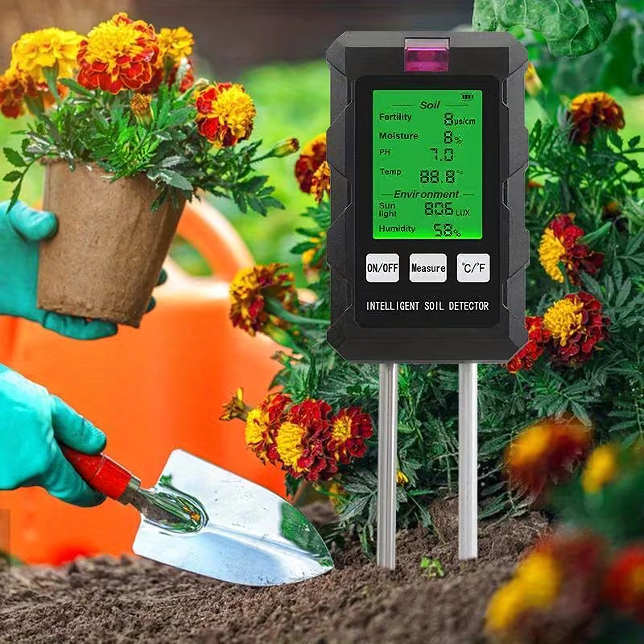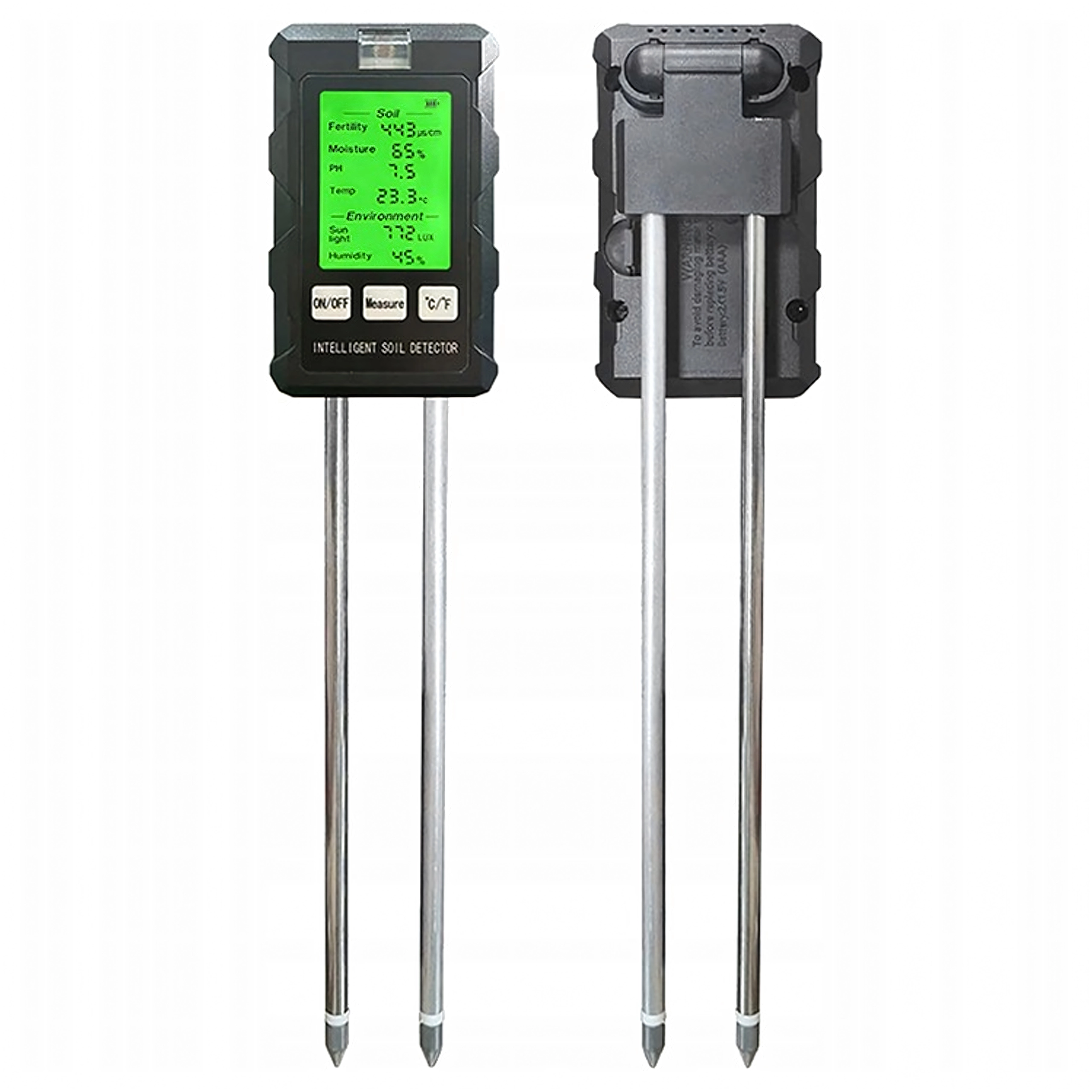 Măsoară pH-ul, umiditatea și temperatura solului, fertilitatea (nutrienții), intensitatea luminii și umiditatea aerului – toate pe un singur ecran cu iluminare din spate pentru decizii rapide în îngrijirea plantelor.