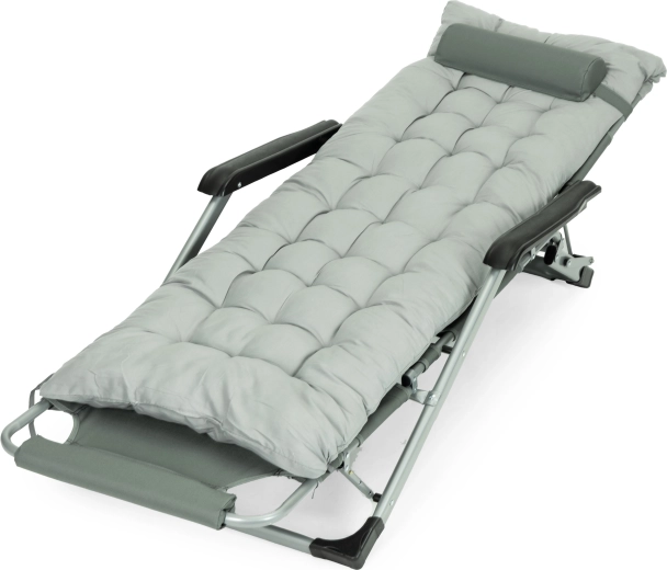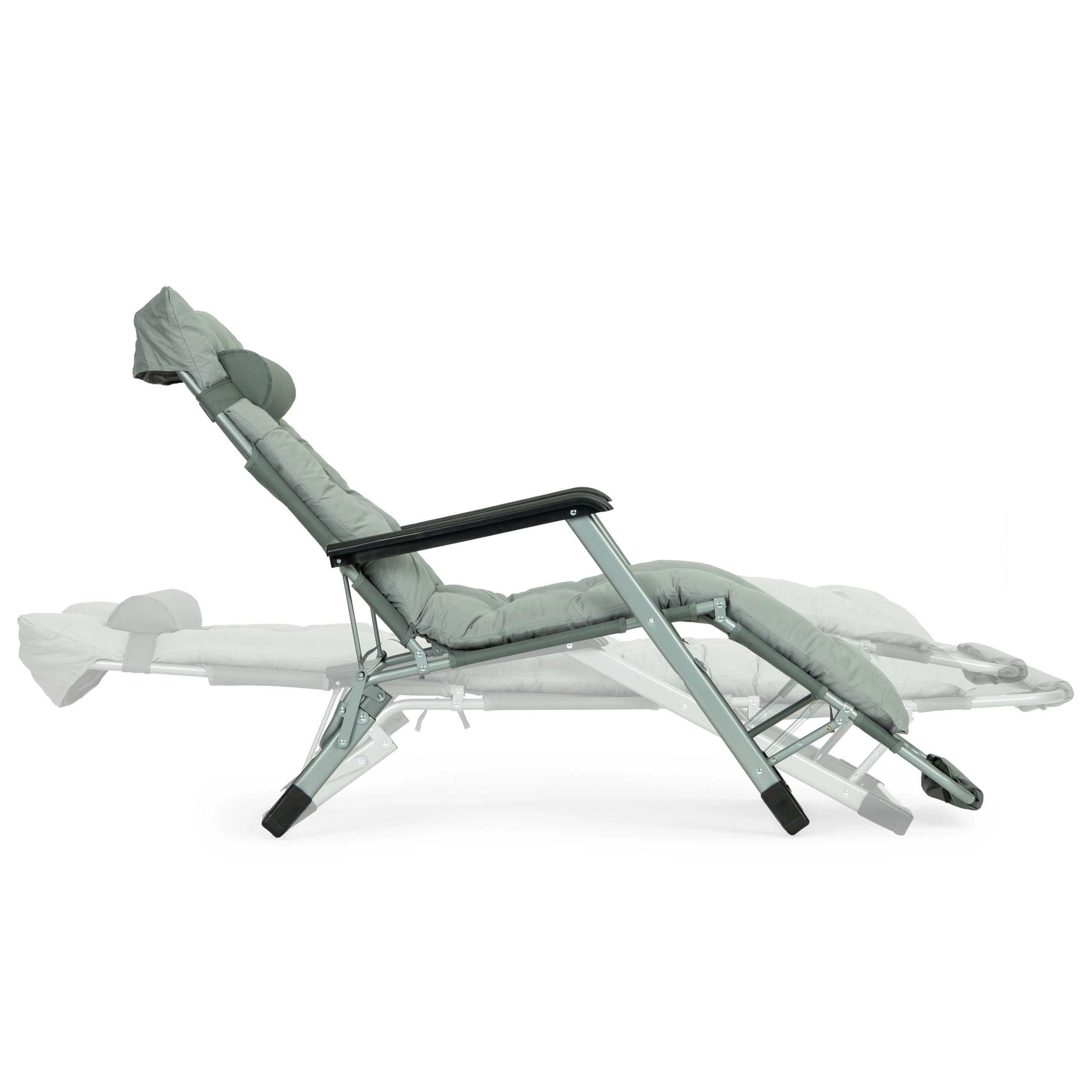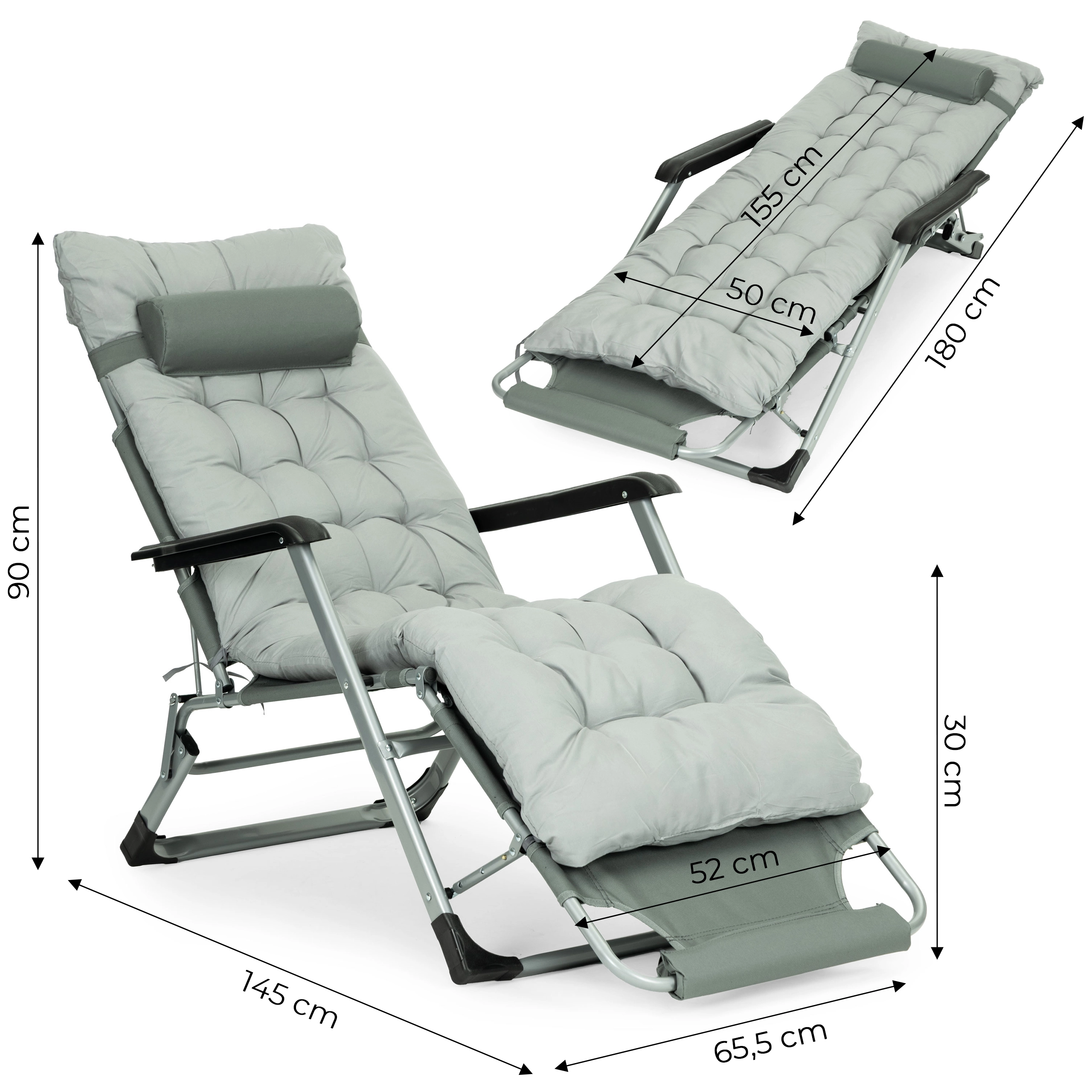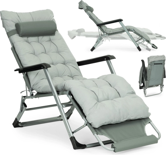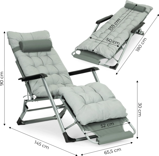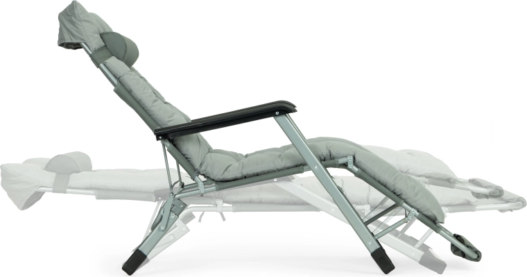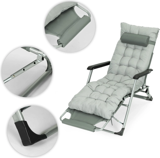 Confortul este asigurat de perna moale matlasată cu tetieră, care acoperă șezutul și spătarul. Reglarea în 3 trepte a suportului pentru picioare vă permite să găsiți poziția perfectă pentru citit, bronzat sau odihnă. Picioarele antiderapante sporesc stabilitatea și protejează podeaua împotriva zgârieturilor.