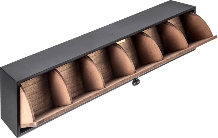 Șase compartimente separate permit sortarea aromelor, păstrarea ordinii și accesul ușor la pliculețul potrivit.