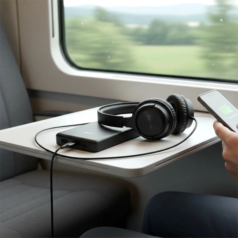 Două USB‑C (intrare/ieșire) și un USB‑A permit alimentarea simultană a până la trei dispozitive. Excelent pentru telefon, e‑reader și consolă portabilă.