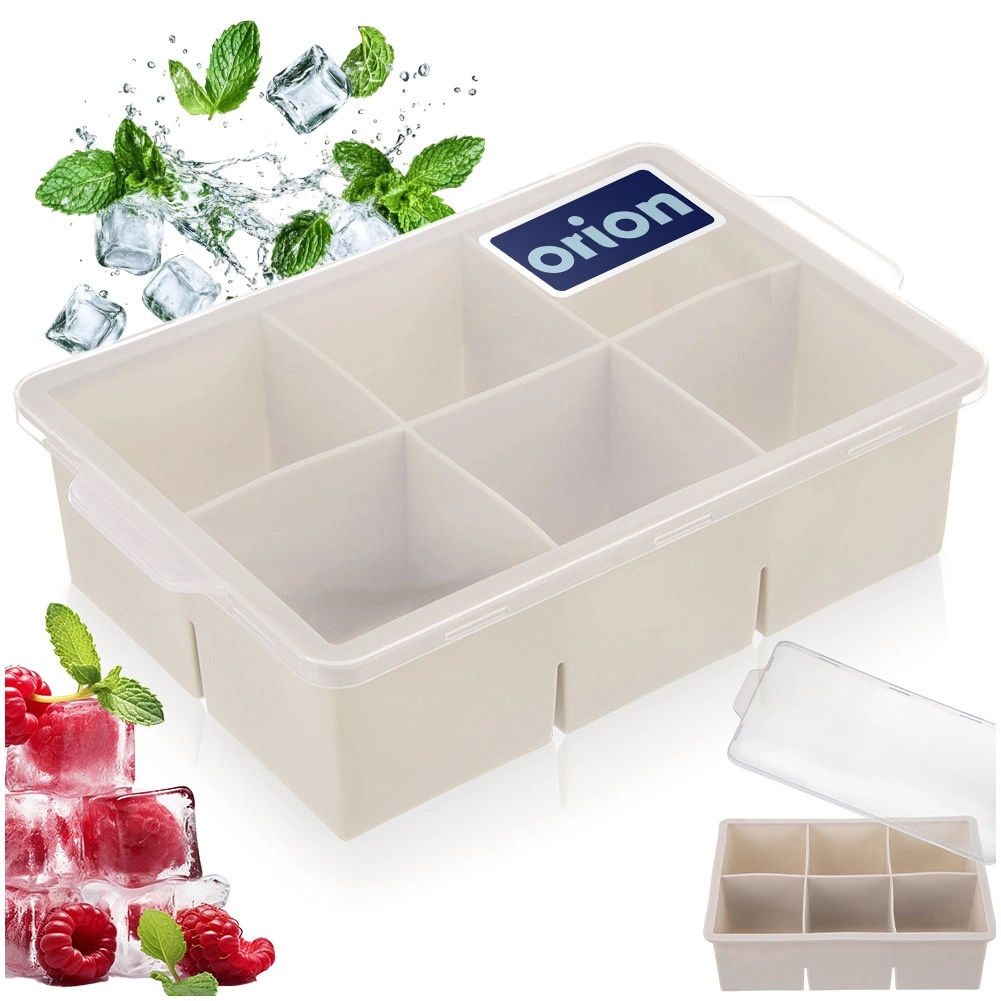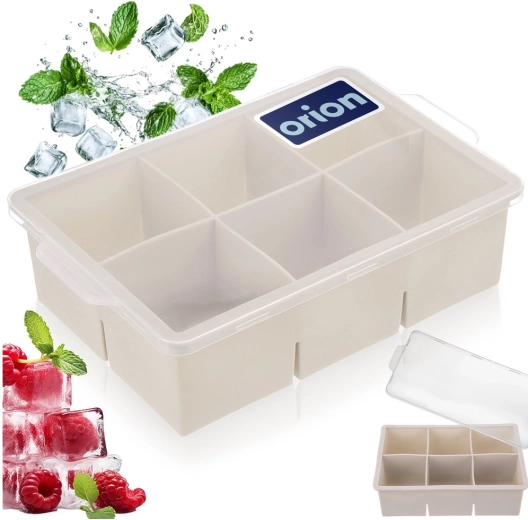 Descoperă forma ideală pentru iubitorii de băuturi perfect răcite. Această formă bej din silicon cu capac produce șase cuburi XXL de gheață de 5 × 5 × 5 cm, care se topesc mai lent și oferă răcire de durată pentru apă, limonade, cocktailuri și distilate premium.