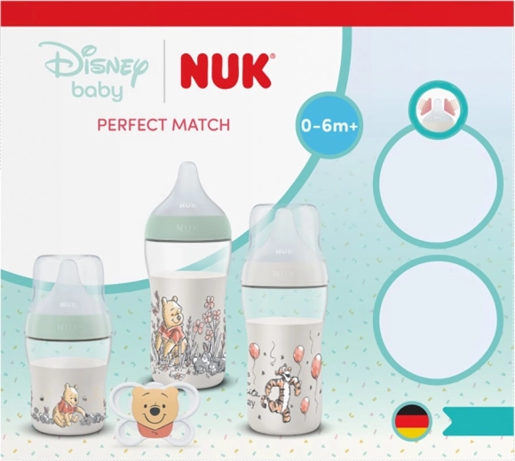Descoperă setul practic pentru bebeluși NUK Perfect Match cu motiv DISNEY Winnie the Pooh. Tetina extra moale și flexibilă se adaptează în mod natural gurii copilului, favorizează prinderea ușoară și, datorită funcției anticolici, asigură un flux lin. Trei biberoane cu indicator de temperatură și capac etanș sunt completate de o suzetă din silicon pentru copii de 0–6 luni.
