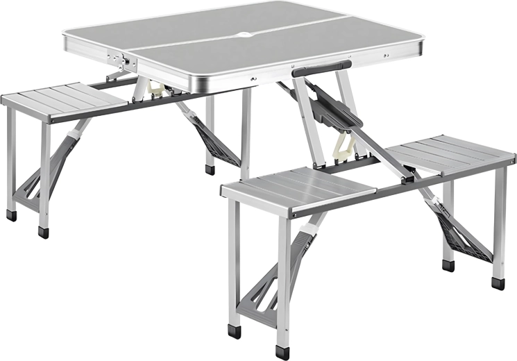 Bucurați-vă de mese confortabile în aer liber cu setul practic pentru patru persoane. Construcția stabilă cu întăriri în cruce și capete antiderapante ale picioarelor asigură stabilitate fiabilă atât pe iarbă, cât și pe suprafețe dure. După pliere, masa și băncile se blochează într-un geamantan portabil, ușor de pus în mașină sau dulap.