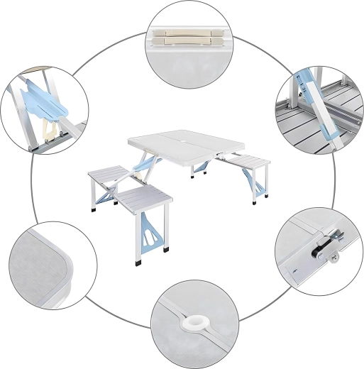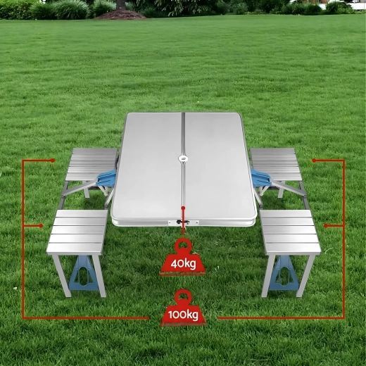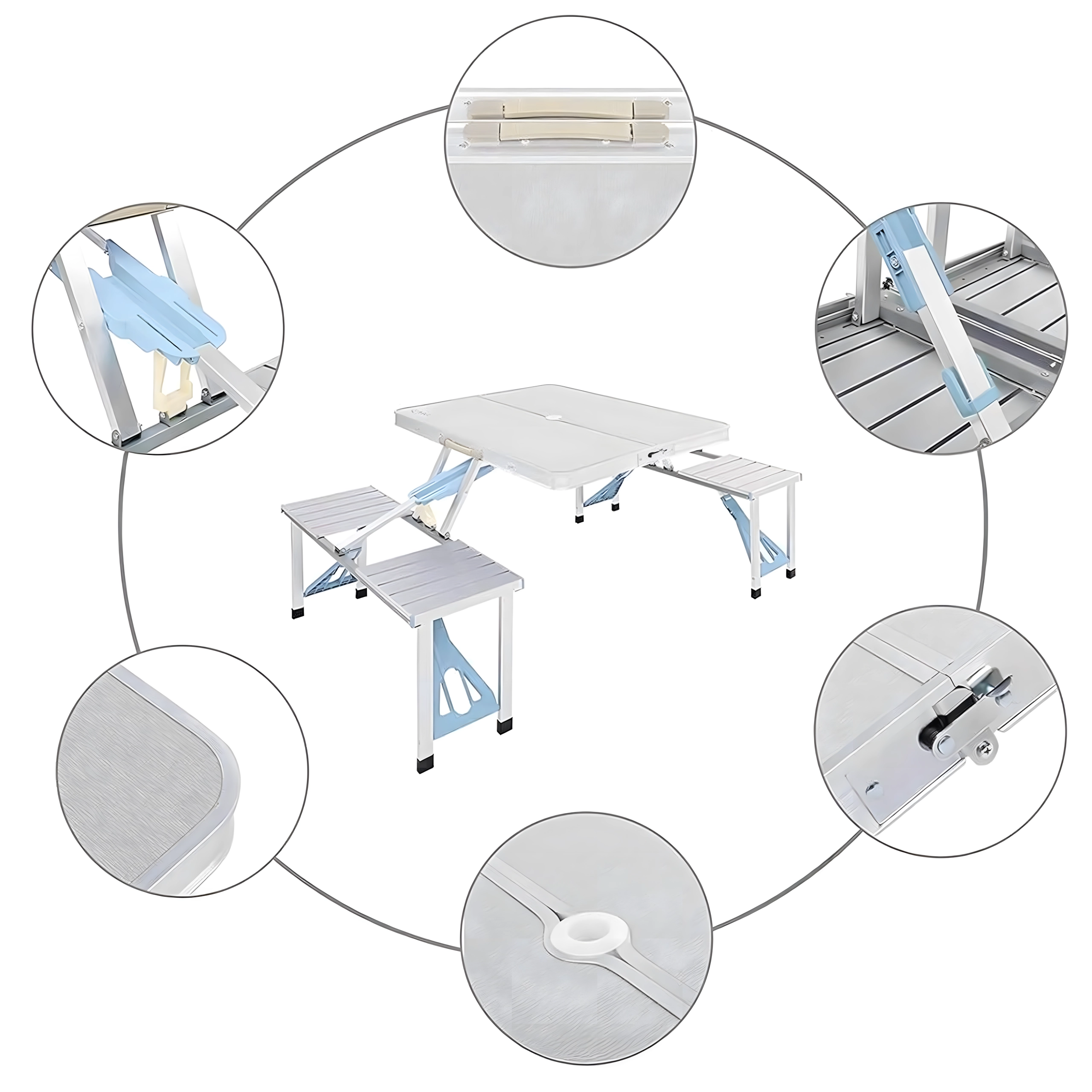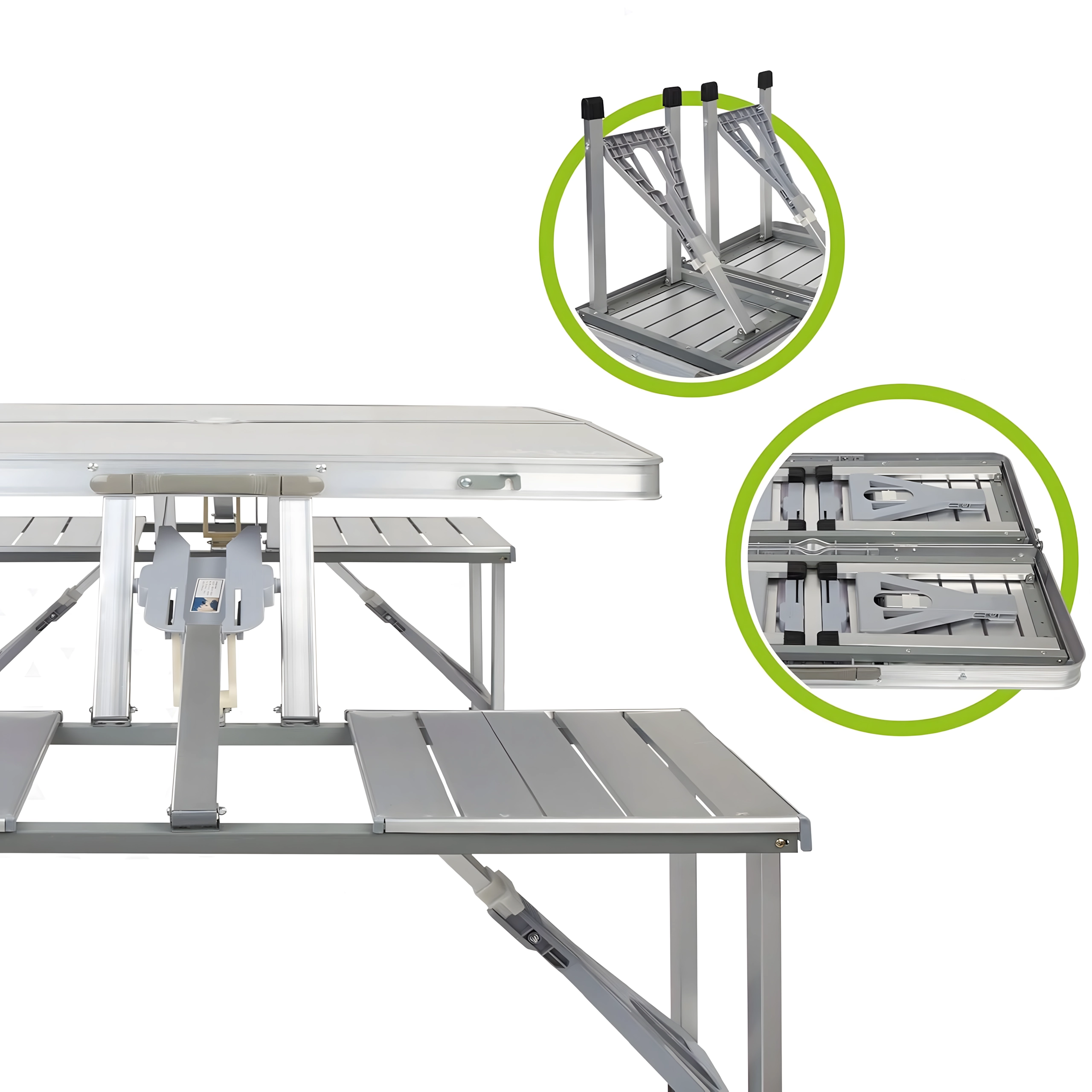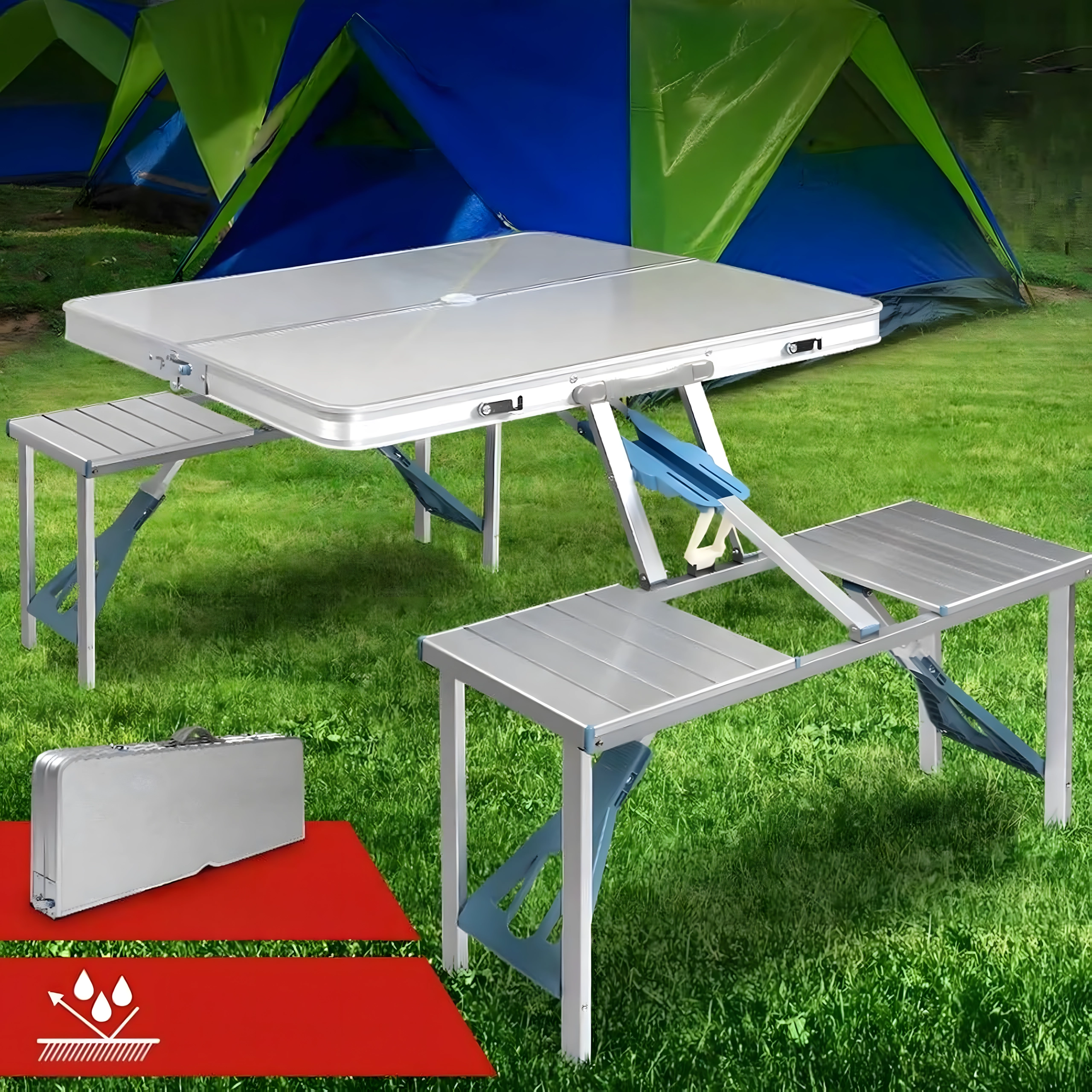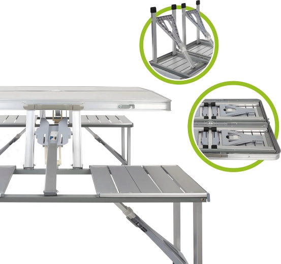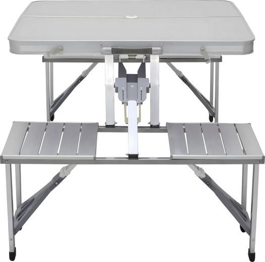 Practică și ușoară, masa de camping pliabilă cu 4 scaune integrate este ideală pentru picnic, camping, plajă și grădină. Combinația rezistentă de aluminiu și PVC asigură o durată lungă de viață, iar după pliere întregul set se transformă într-un geamantan compact cu mâner. Masa are orificiu pentru umbrelă, astfel încât vă bucurați de umbră plăcută chiar și în zilele călduroase.