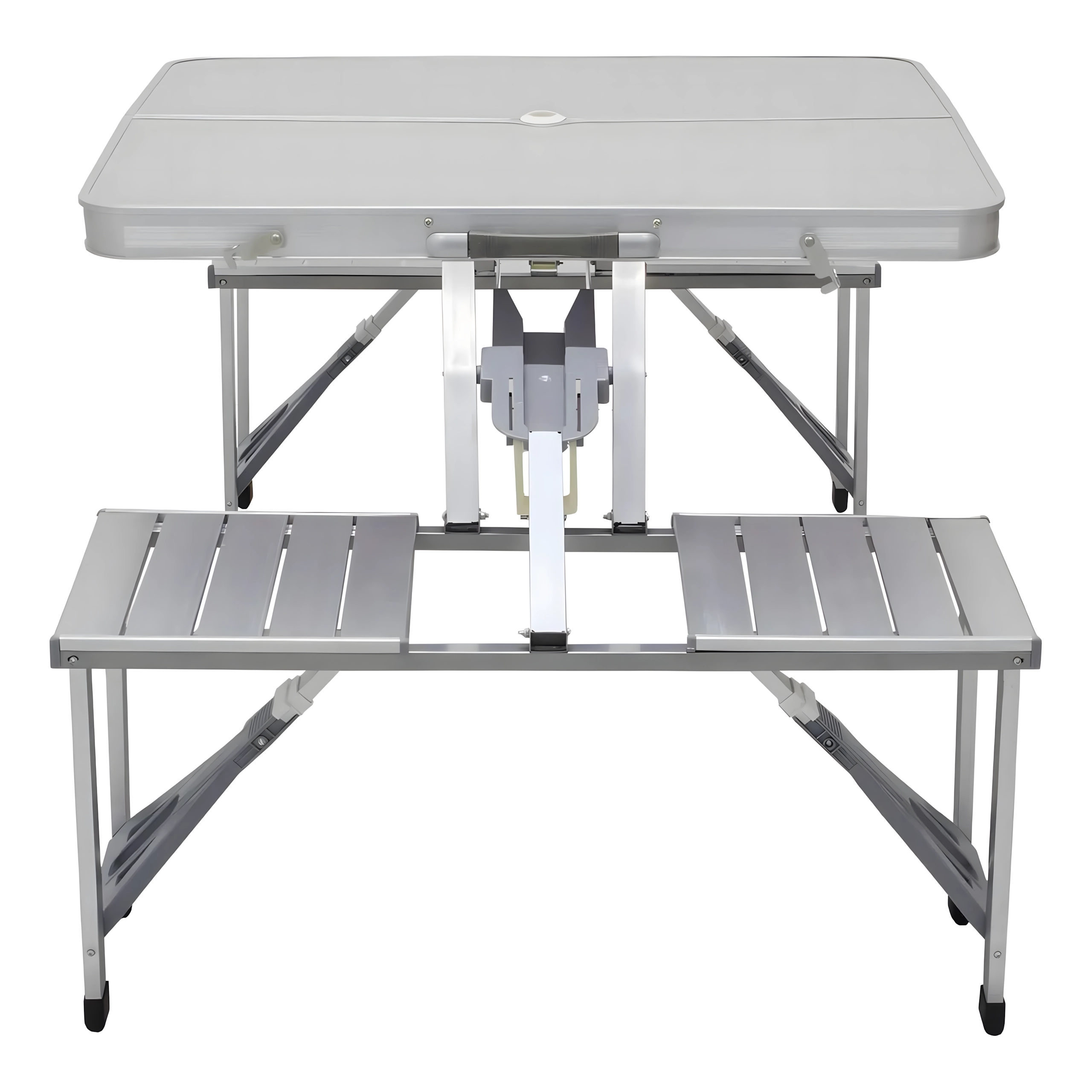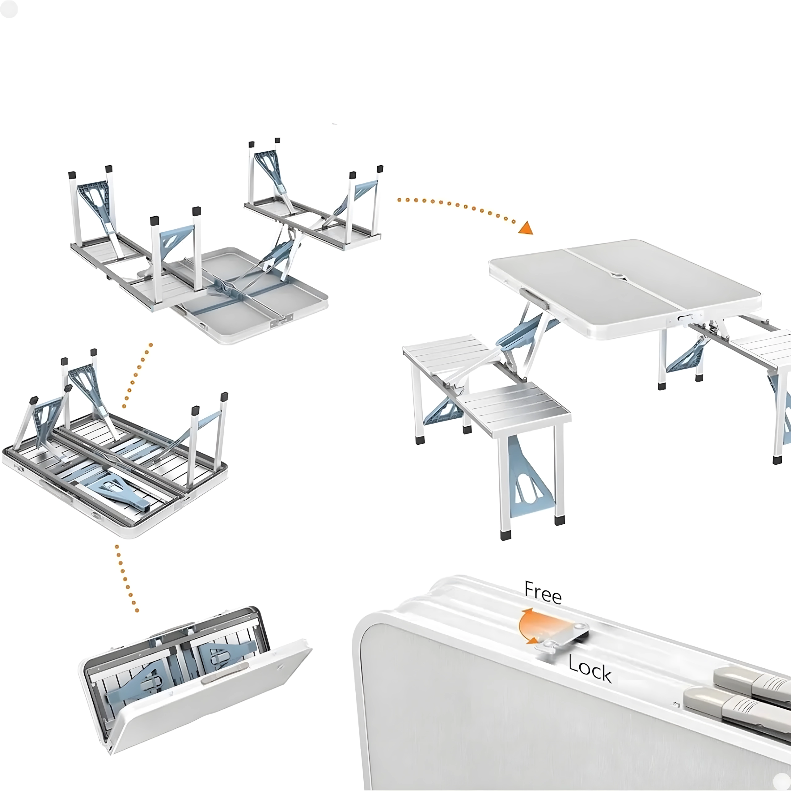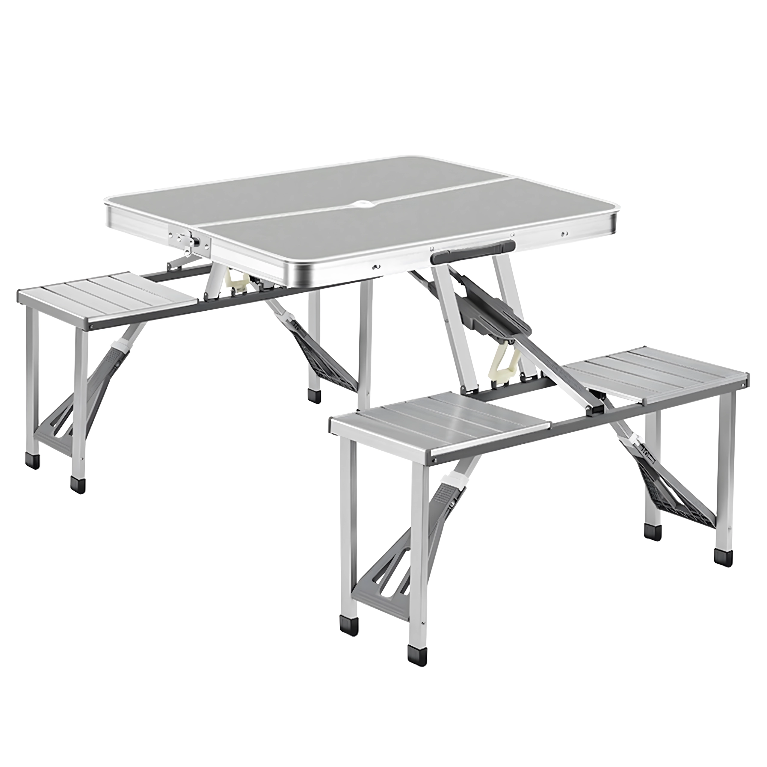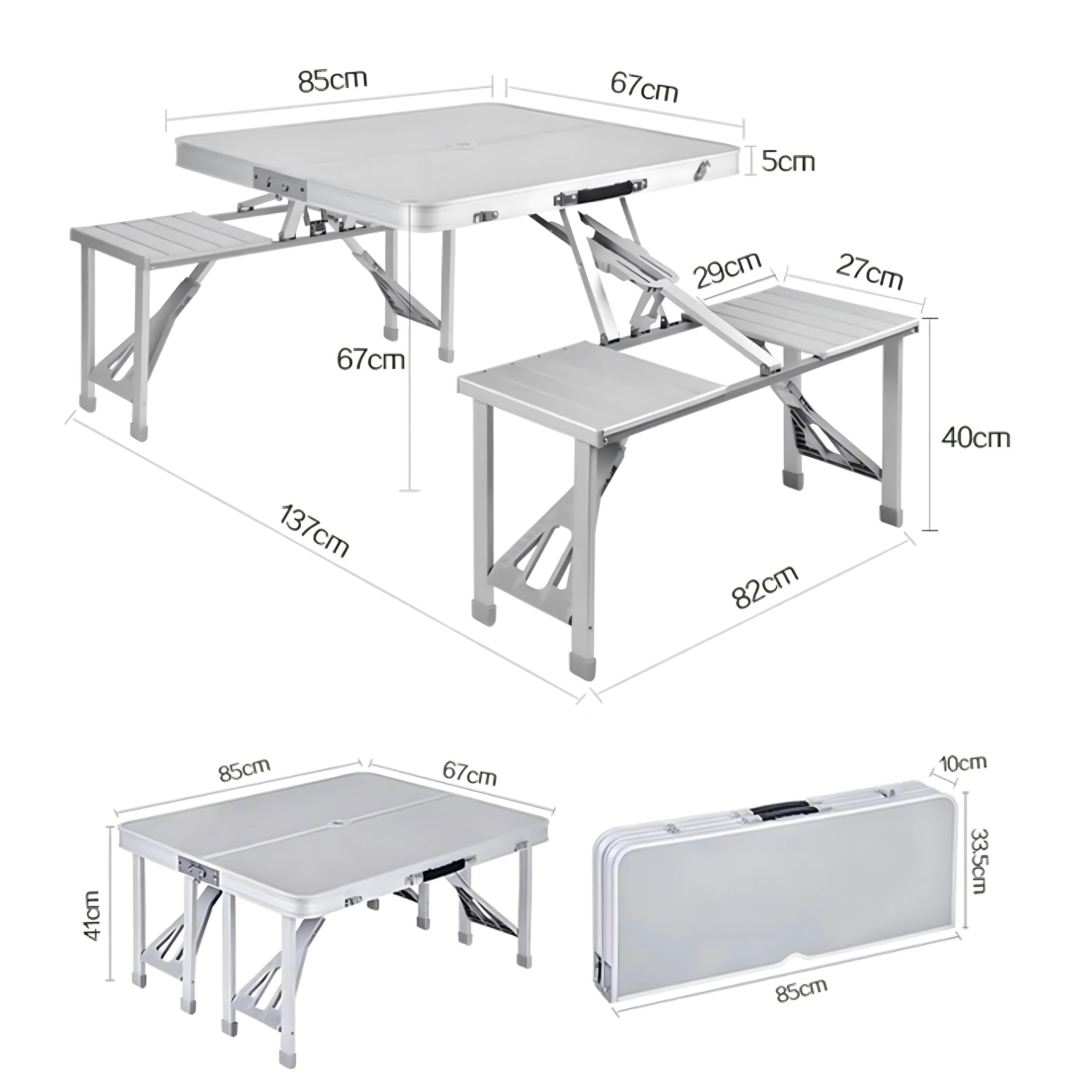 Practică și ușoară, masa de camping pliabilă cu 4 scaune integrate este ideală pentru picnic, camping, plajă și grădină. Combinația rezistentă de aluminiu și PVC asigură o durată lungă de viață, iar după pliere întregul set se transformă într-un geamantan compact cu mâner. Masa are orificiu pentru umbrelă, astfel încât vă bucurați de umbră plăcută chiar și în zilele călduroase.
