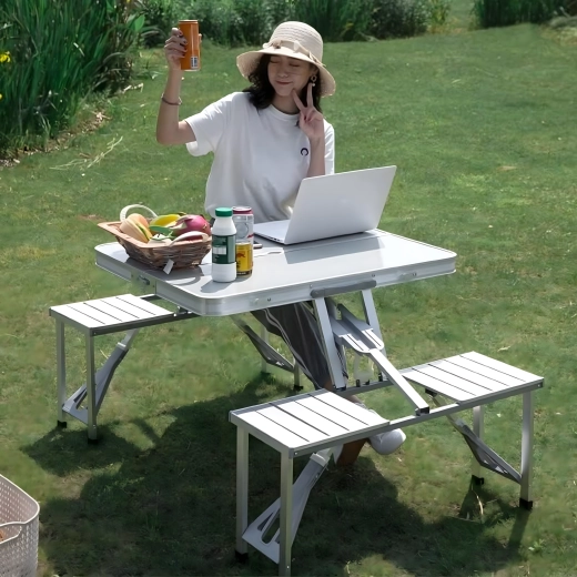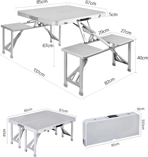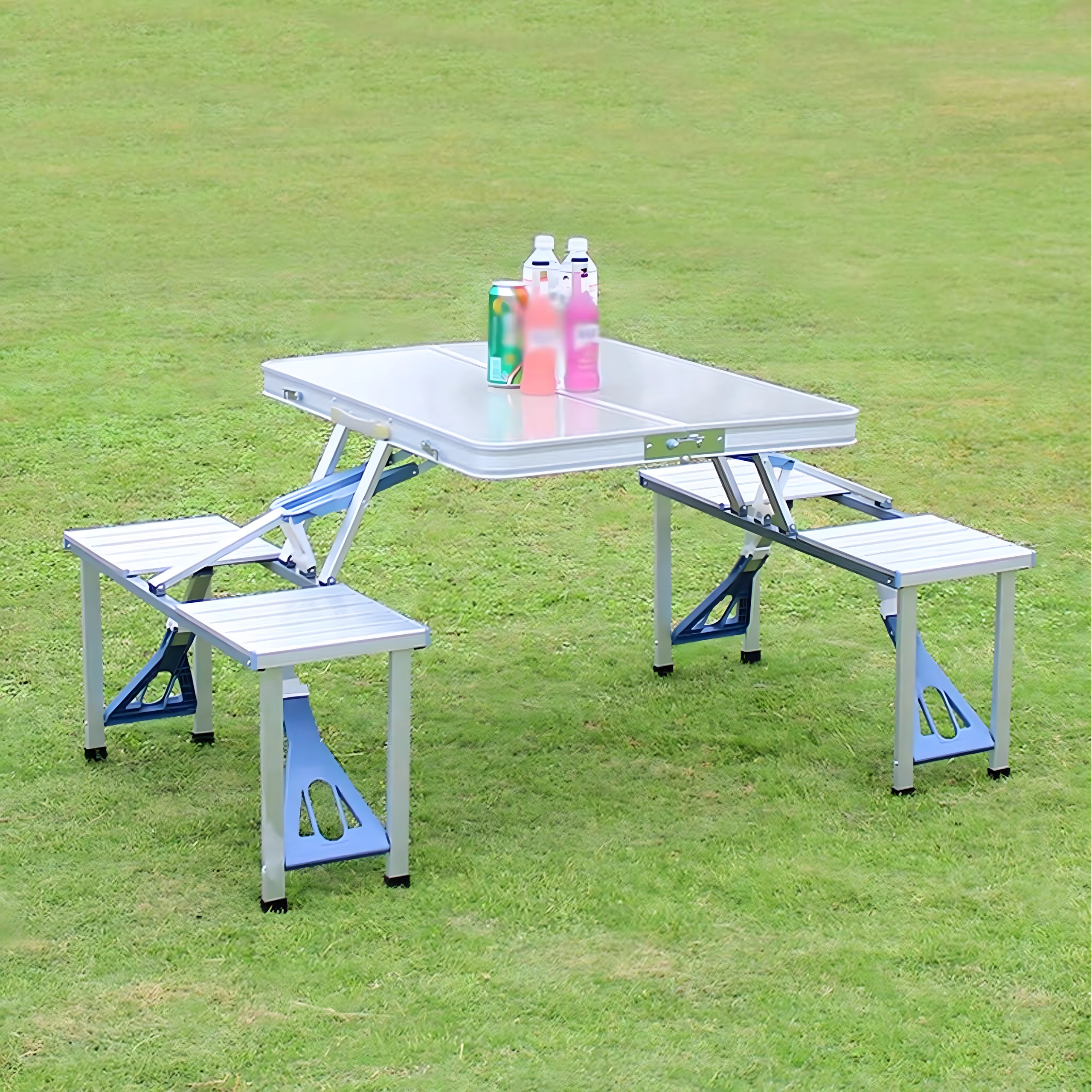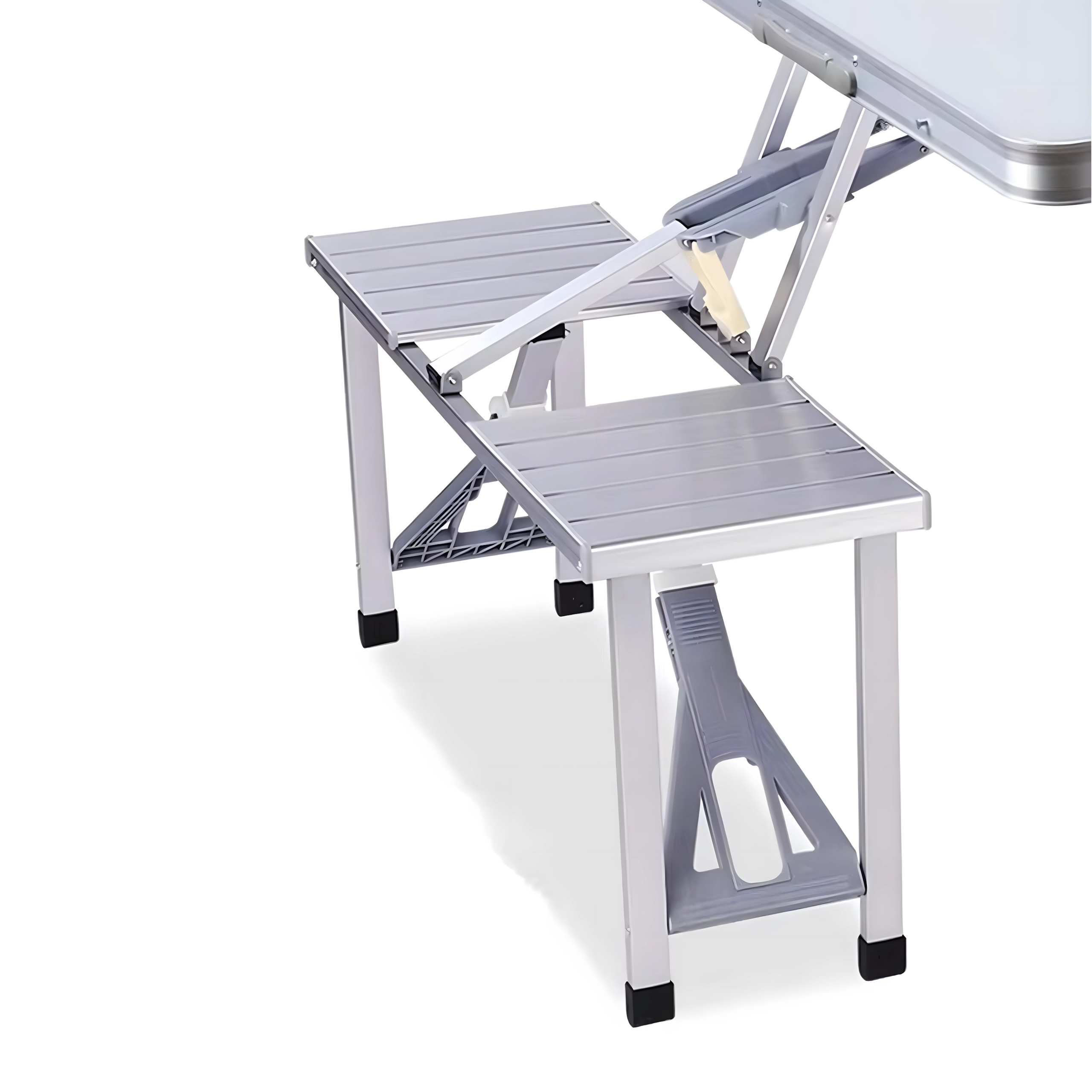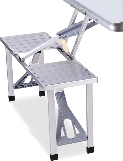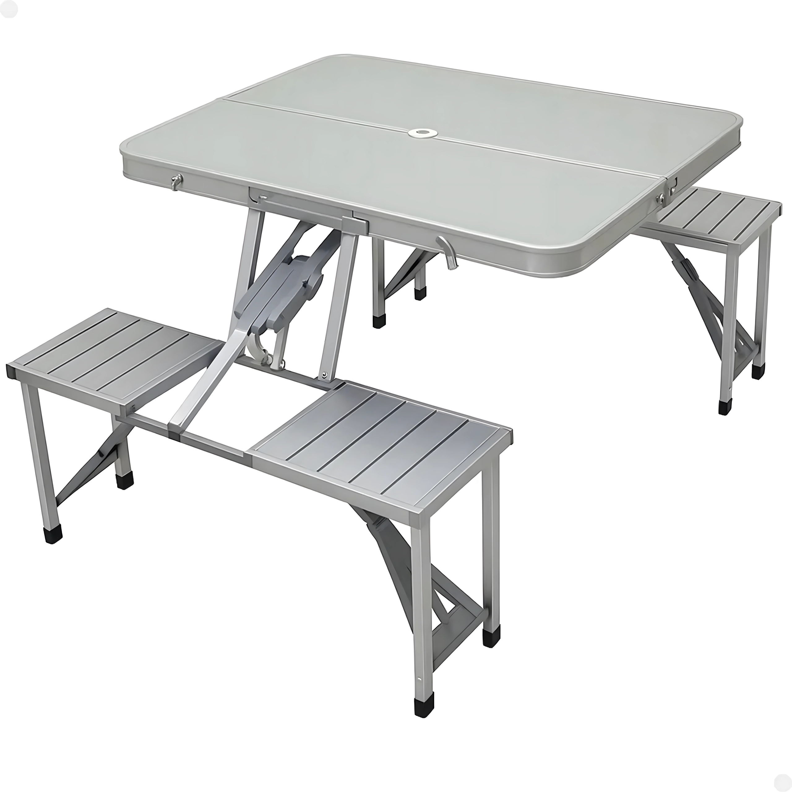 Practică și ușoară, masa de camping pliabilă cu 4 scaune integrate este ideală pentru picnic, camping, plajă și grădină. Combinația rezistentă de aluminiu și PVC asigură o durată lungă de viață, iar după pliere întregul set se transformă într-un geamantan compact cu mâner. Masa are orificiu pentru umbrelă, astfel încât vă bucurați de umbră plăcută chiar și în zilele călduroase.