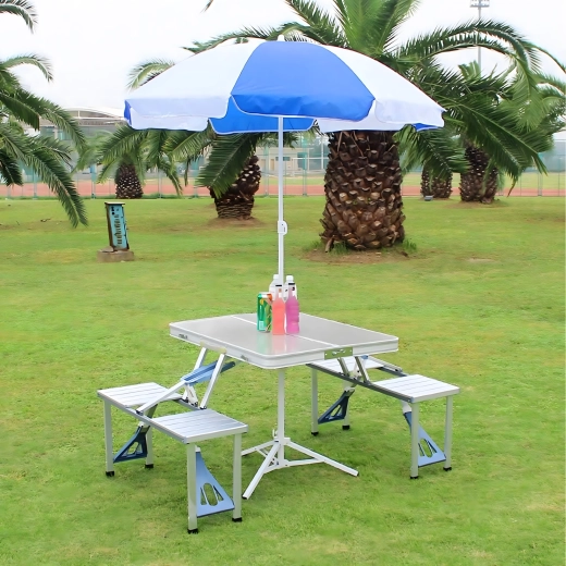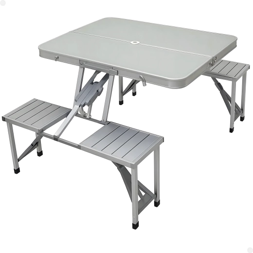 Blatul mesei este ușor de curățat și rezistent la intemperii. Orificiul central pentru umbrelă oferă umbrire flexibilă – ideală pentru picnicuri de vară sau camping. Datorită asamblării rapide fără unelte, setul este gata de utilizare în câteva clipe.