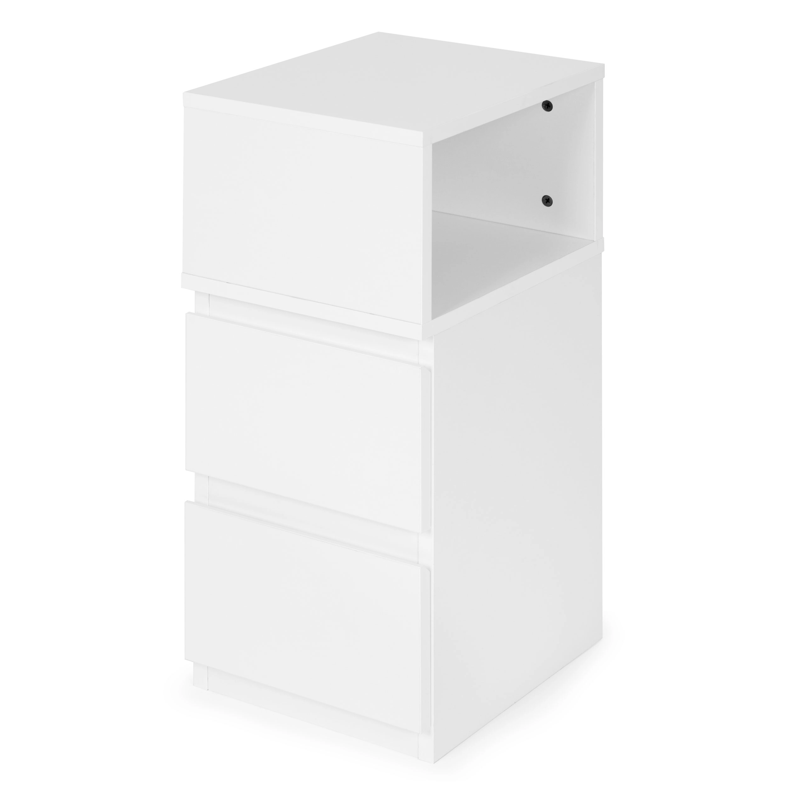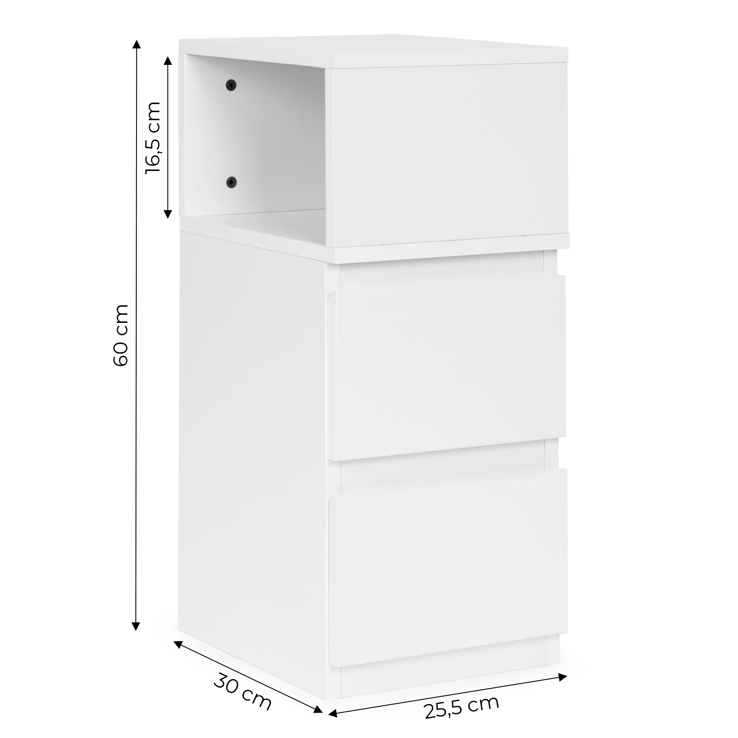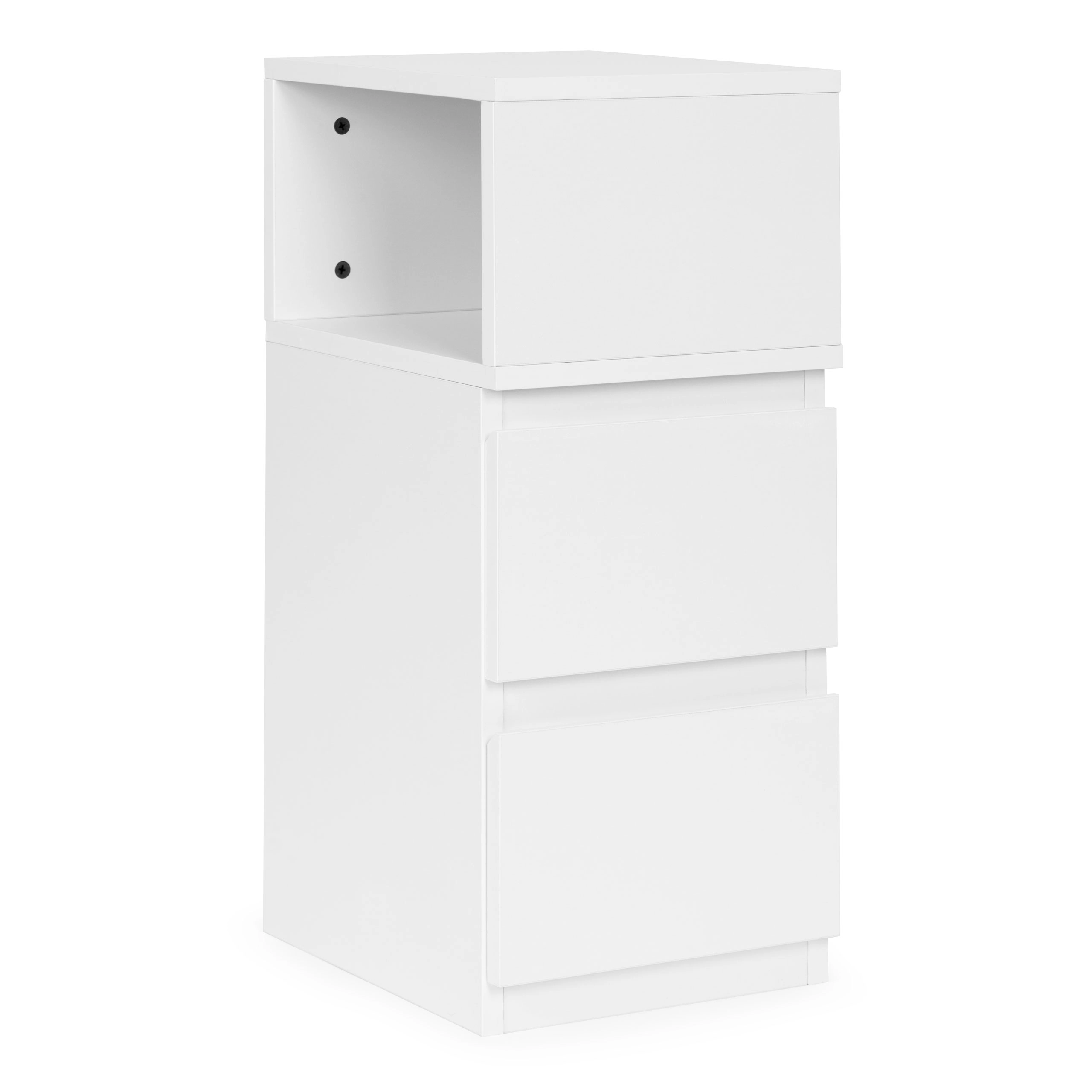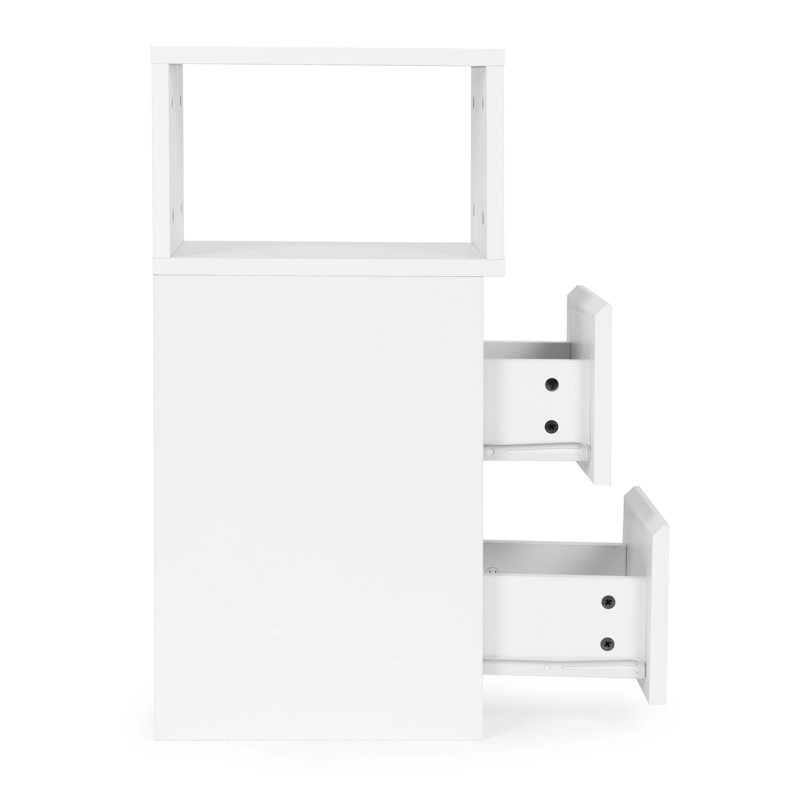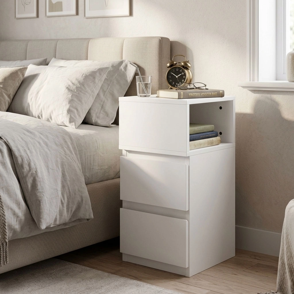 Depozitează tot ce ai nevoie: două sertare spațioase pentru ordine fără compromisuri și un compartiment deschis superior pentru cărți, ochelari sau telefon la îndemână.