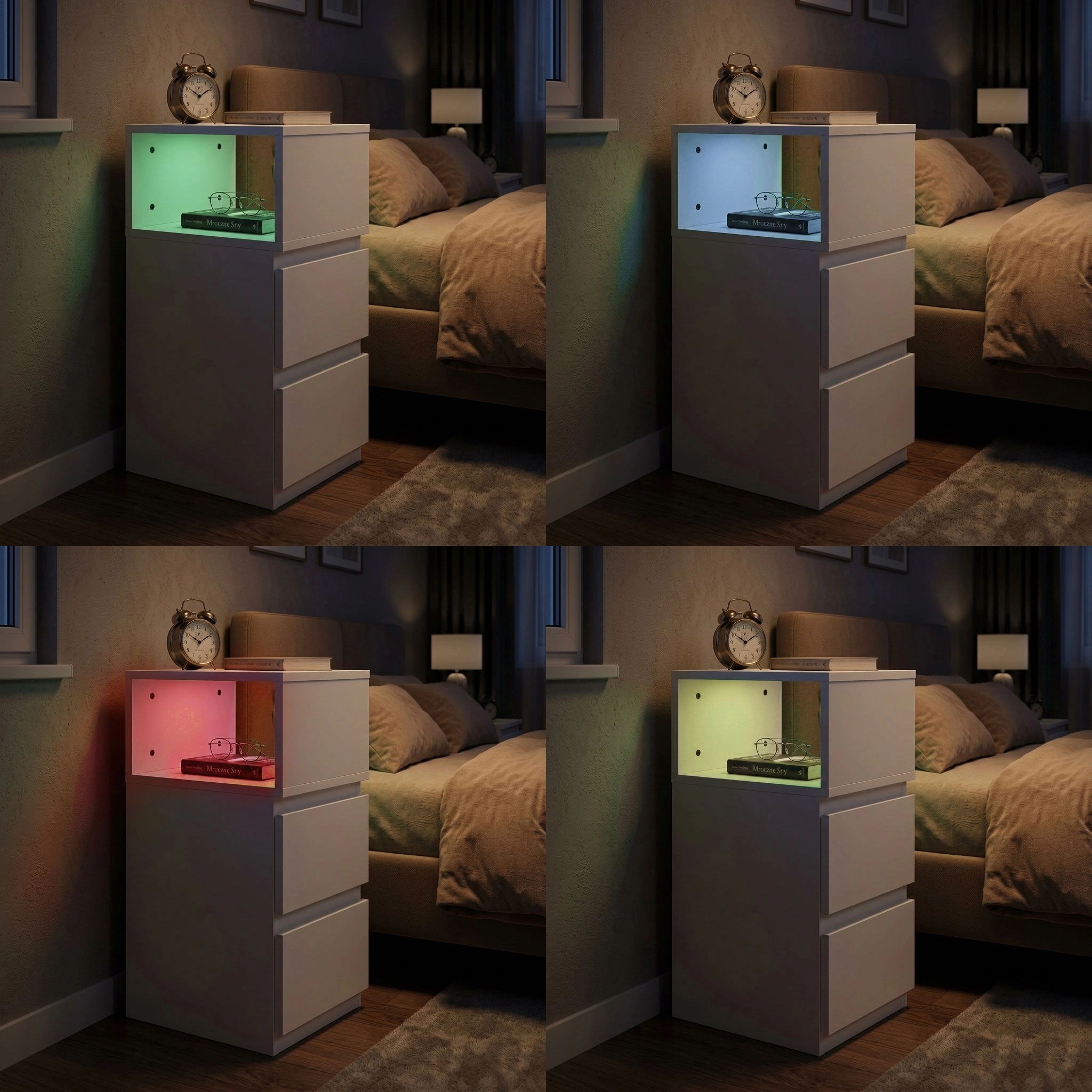 Rafinează atmosfera dormitorului cu noptiera stilată ModernHome. Iluminarea RGB LED integrată în compartimentul deschis induce liniște pentru lectură și relaxare de seară. Controlul este simplu – cu telecomanda alegi dintre 16 culori și efecte (Flash, Strobe, Fade, Smooth), în timp ce aplicația mobilă oferă o paletă și mai largă și reglare lină a luminozității.