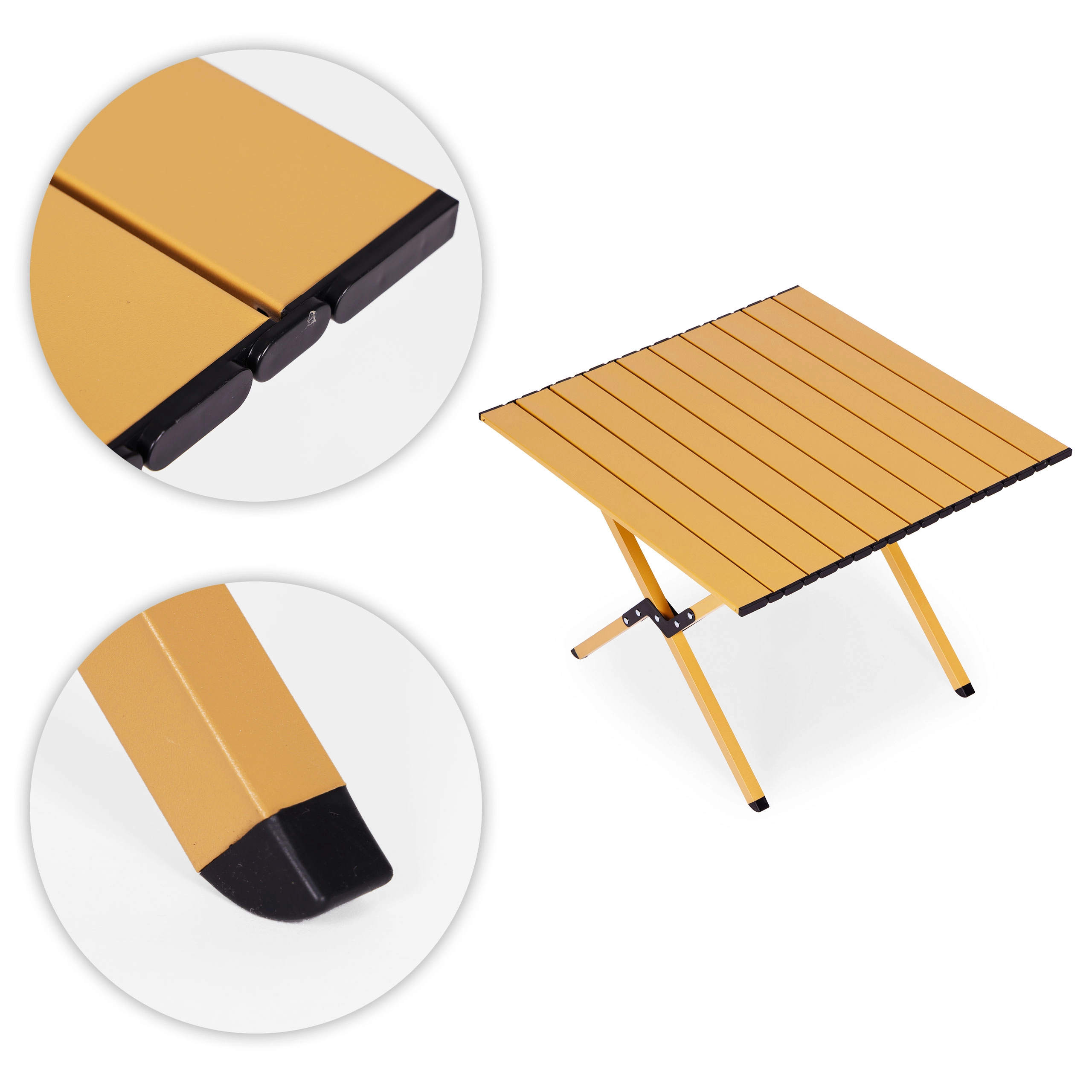 Masa se pliază și se desface în câteva momente, iar datorită elementelor de blocare rămâne ferm pe poziție. Piciorușele antiderapante sporesc stabilitatea pe iarbă, pământ și terasă. După utilizare, totul se împachetează ușor în geanta inclusă – soluția perfectă pentru camping, la apă sau în grădină.