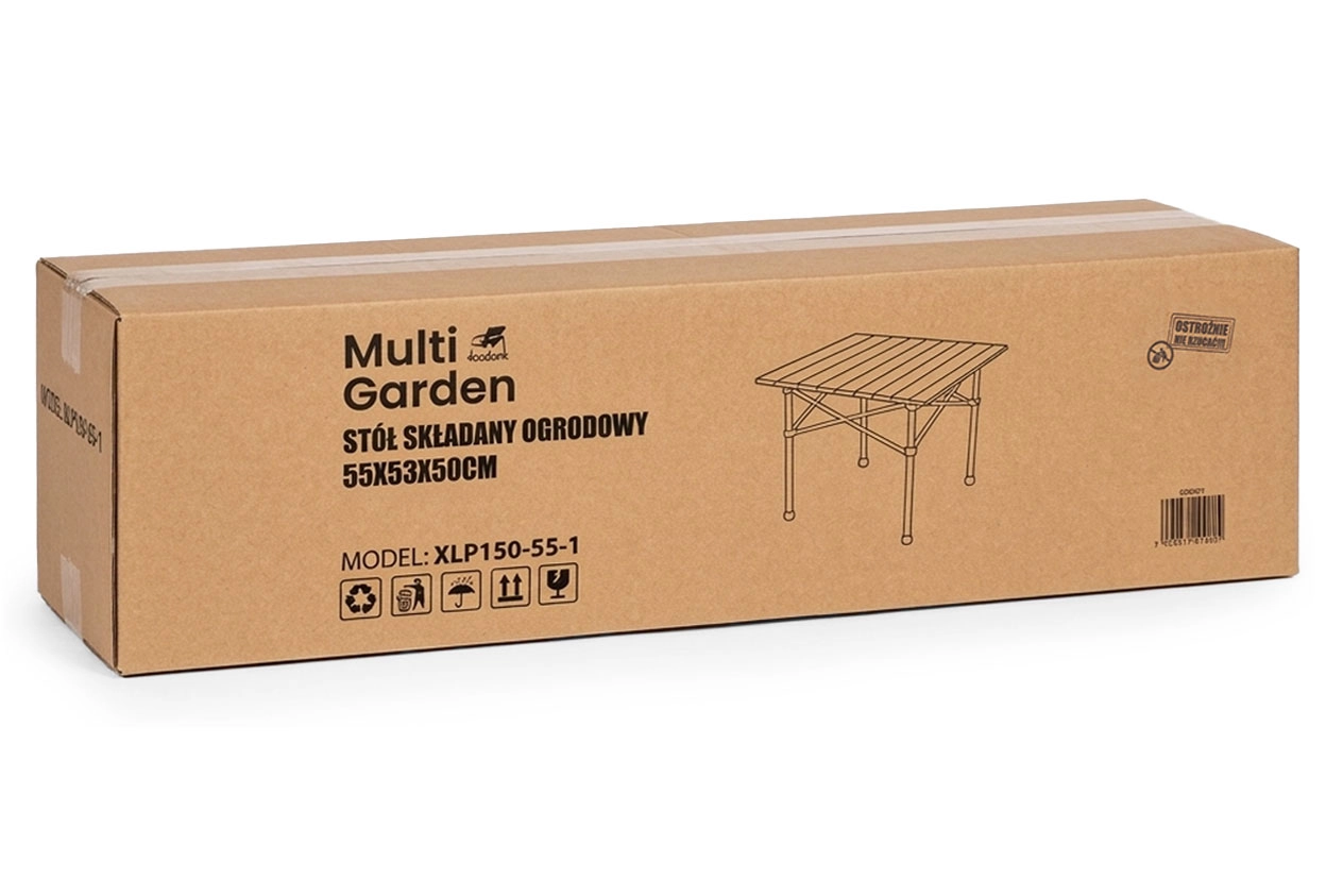 Masa se asamblează fără unelte – blatul lamelar se fixează cu cleme de blocare pe elementele ovale ale cadrului. Capsele antiderapante de la picioare îmbunătățesc aderența și reduc riscul de alunecare. După pliere ocupă minimum de spațiu și, datorită genții de transport, este ideală pentru excursii la apă, la cabană sau în vacanță.