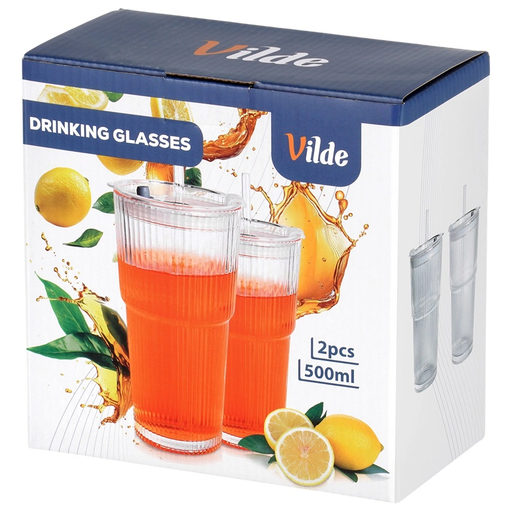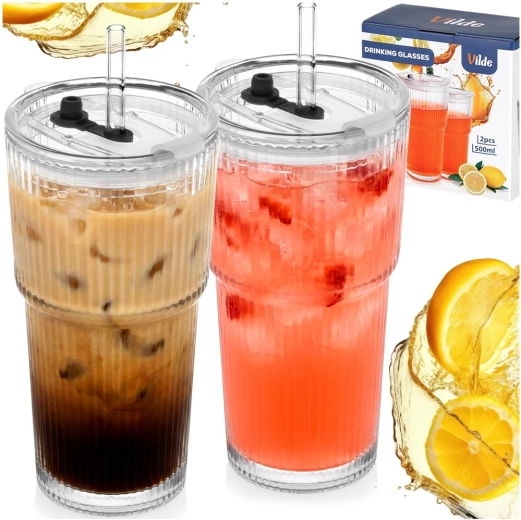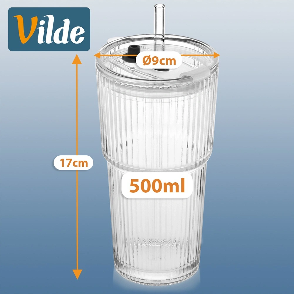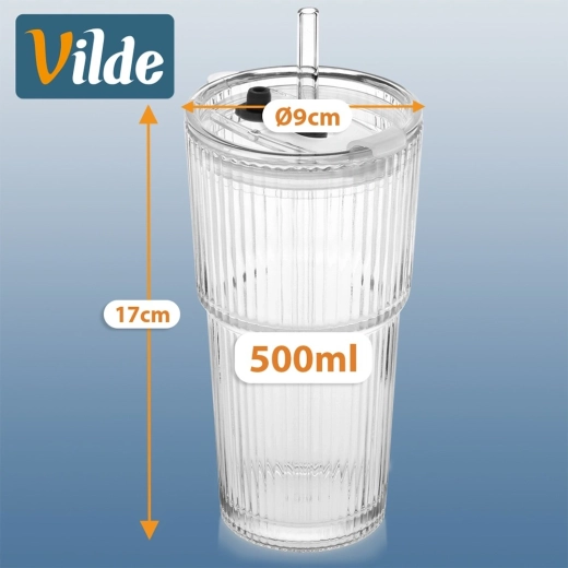 Set elegant de doi tumbleri din sticlă, cu un volum de 500 ml, cu capac etanș și pai reutilizabil. Sticla striată asigură priză fermă, iar capacul cu orificiu minimizează vărsarea; datorită designului universal este excelent pentru băuturi reci și calde. Compatibil cu mașina de spălat vase. Calitate verificată Vilde.