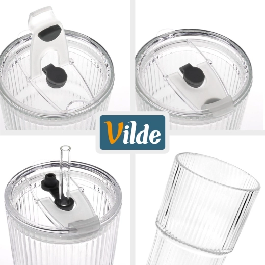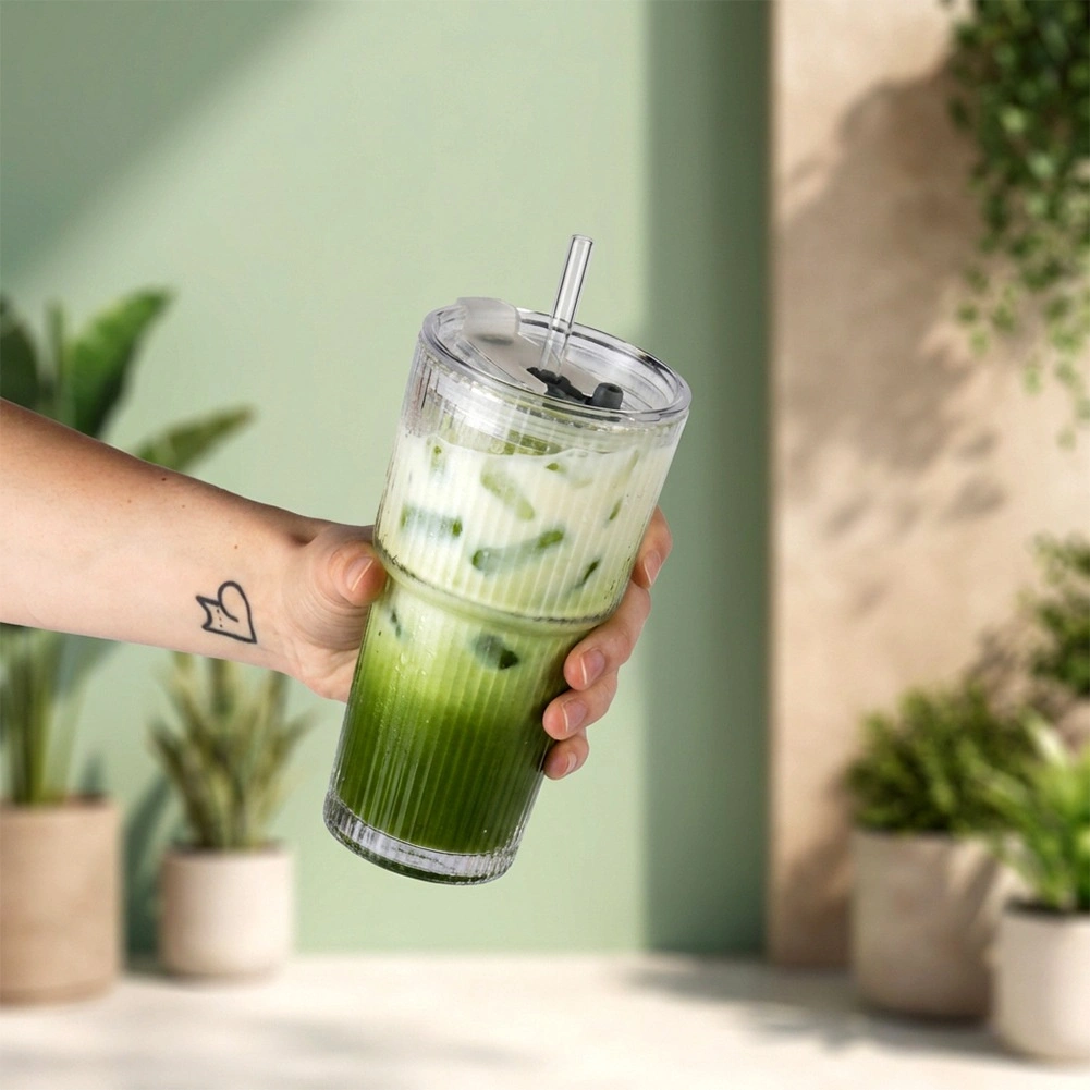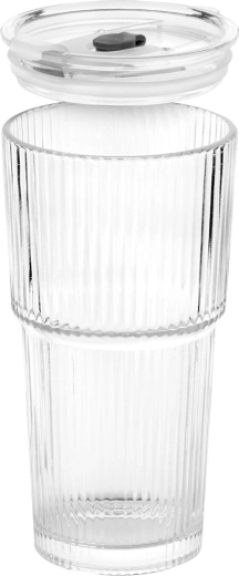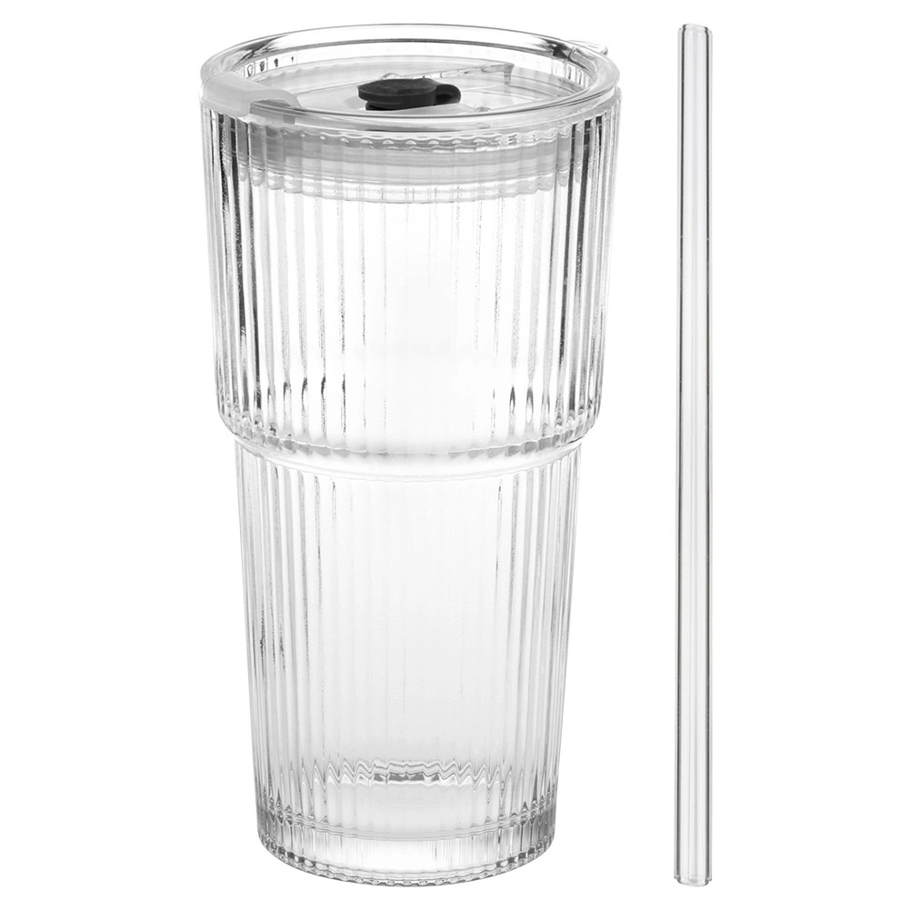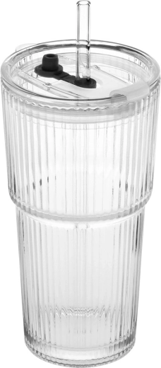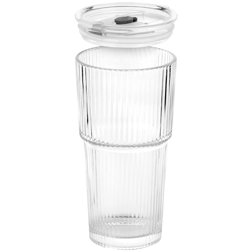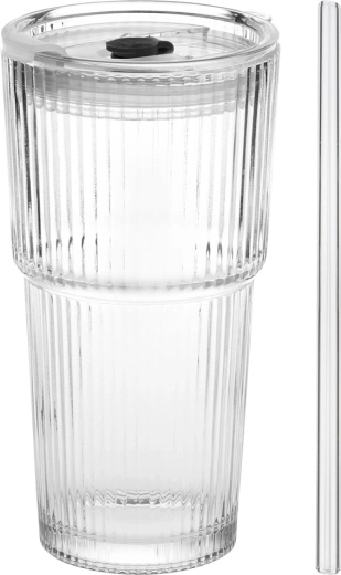 Paharele din sticlă cu striații verticale îmbină practicitatea cu un aspect minimalist. Sticla transparentă pune în valoare limonadele, iced coffee și ceaiul, în timp ce capacul cu etanșare și orificiu pentru pai ajută la limitarea stropirilor nedorite la transport în poziție verticală.