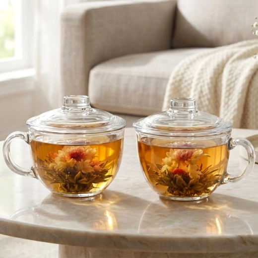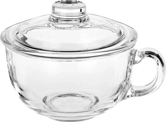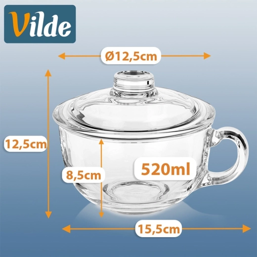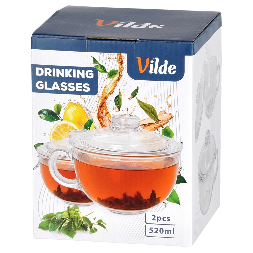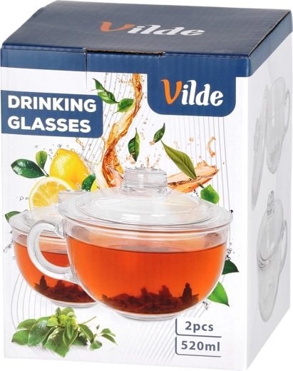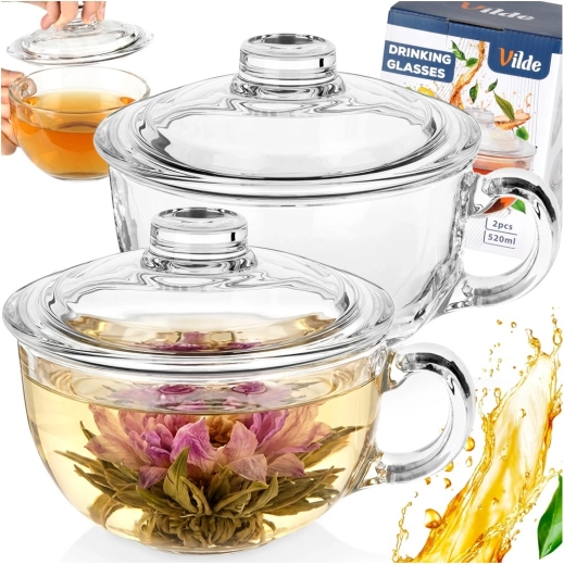 Căni elegante din sticlă cu capac, volum 520 ml, ideale pentru servirea de ceai, infuzii de plante, cafea și băuturi reci. Rezistente la căldură, cu capac practic pentru menținerea temperaturii și toartă comodă pentru prindere sigură. Potrivite pentru mașina de spălat vase.