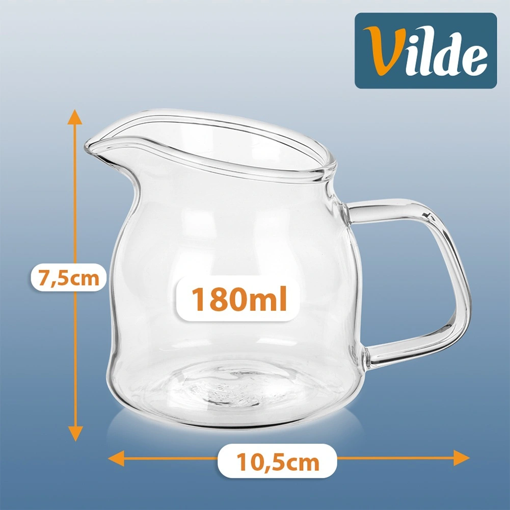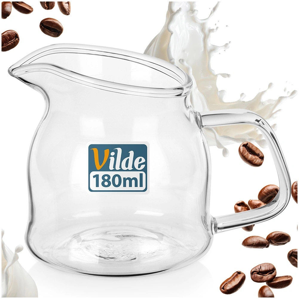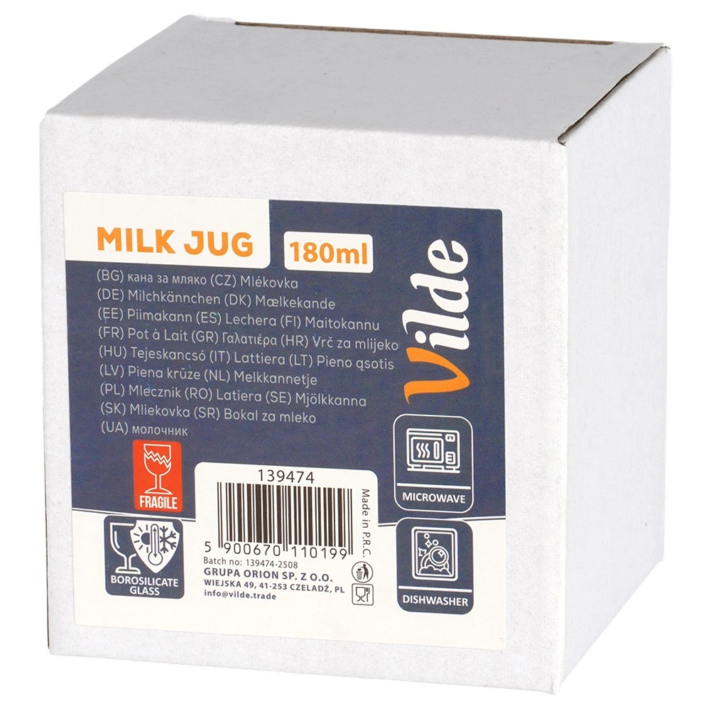 Cană pentru lapte elegantă, cu un volum de 180 ml, realizată din sticlă borosilicată rezistentă, pentru servirea stilată a laptelui, smântânii sau sosurilor. Are un cioc practic pentru turnare precisă, mâner confortabil și este potrivită pentru mașina de spălat vase și cuptorul cu microunde. Ideală pentru uz casnic și unități HoReCa.