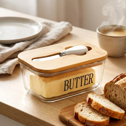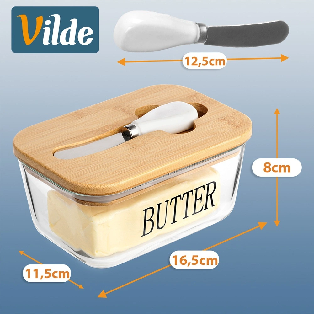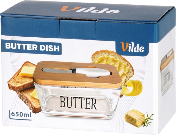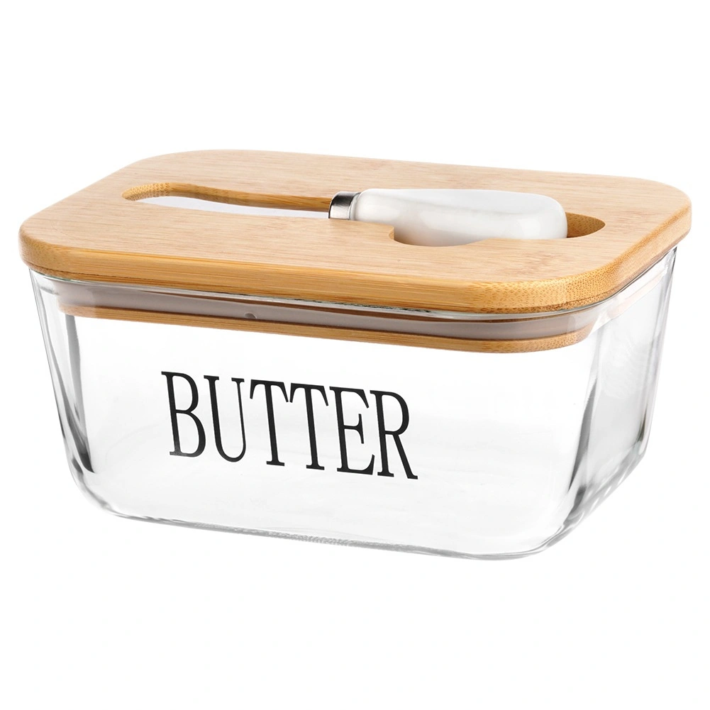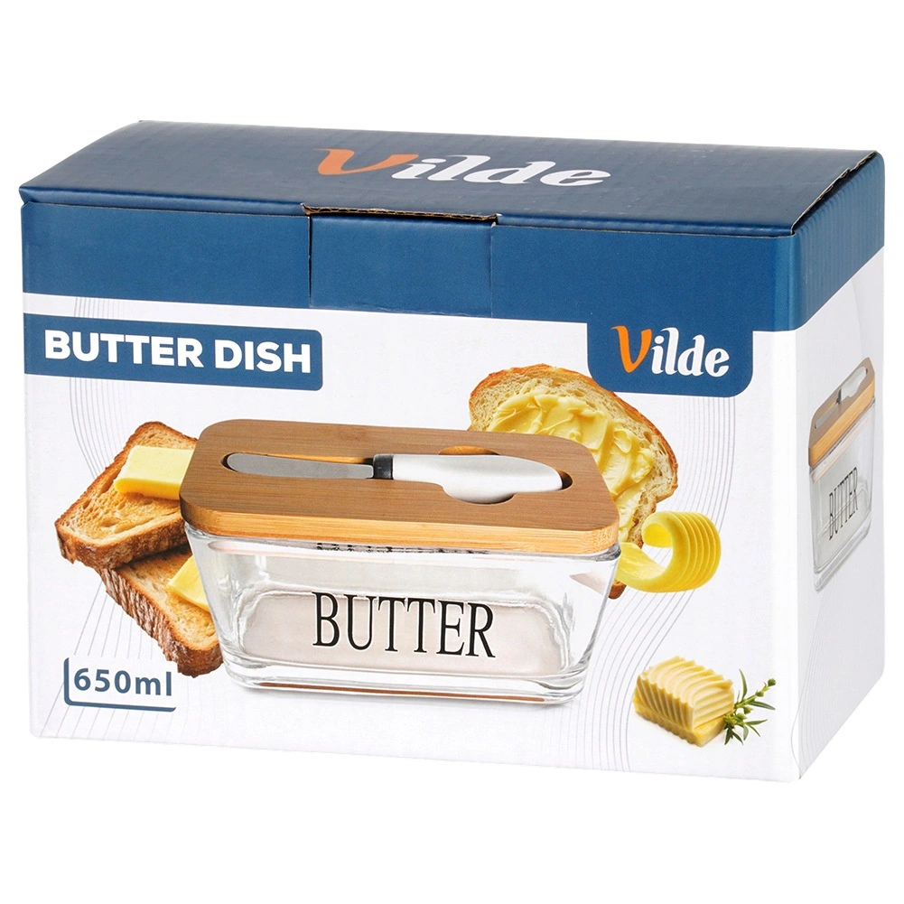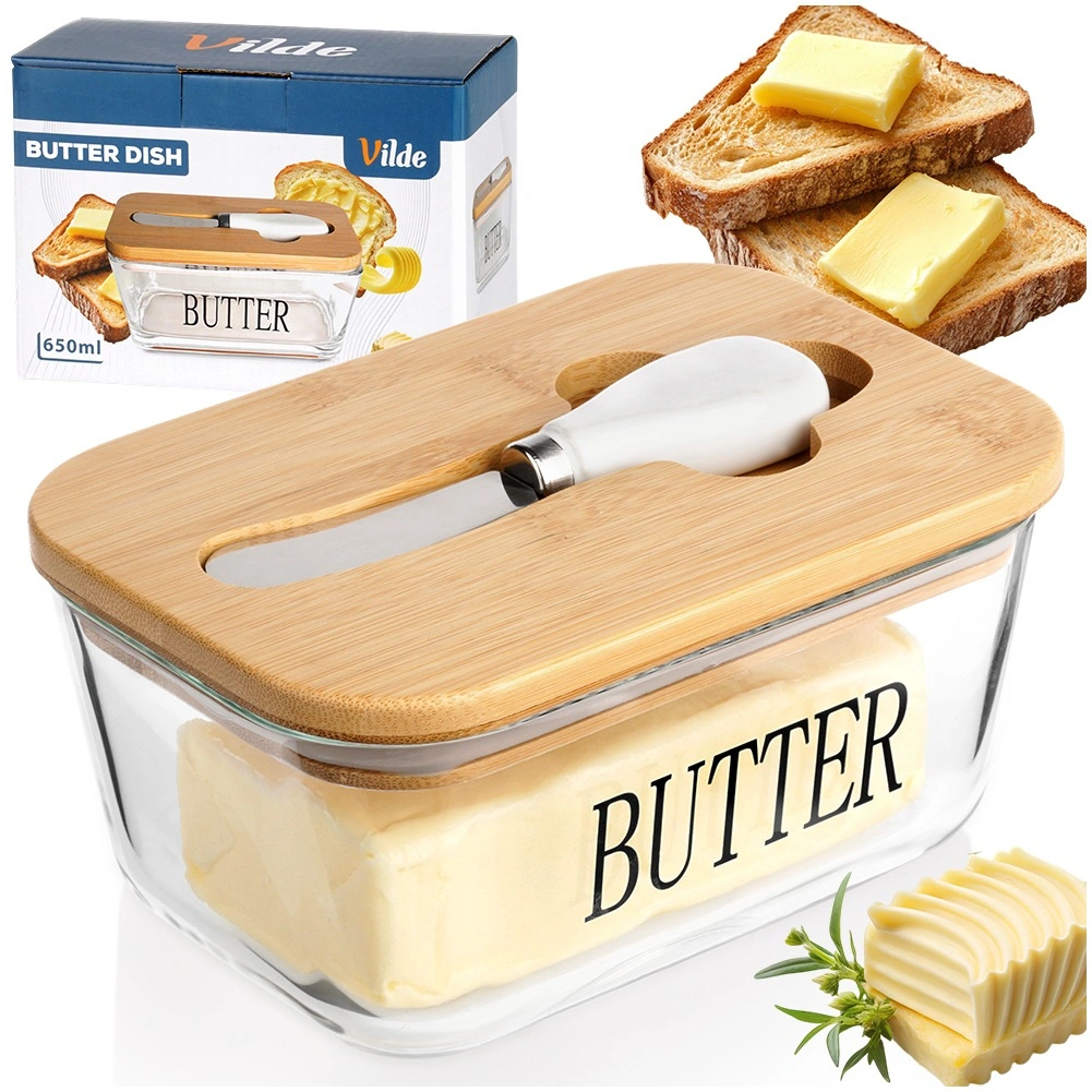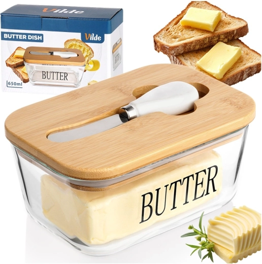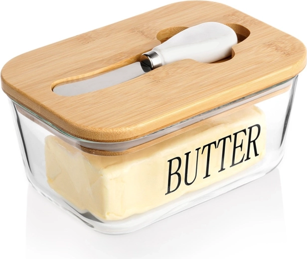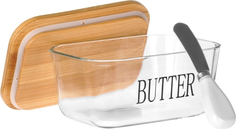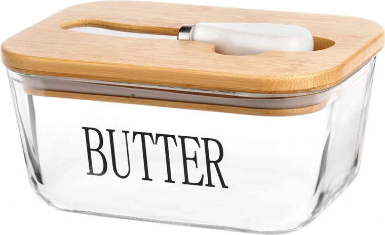 Recipient elegant pentru unt din sticlă cu capac din bambus și cuțitaș integrat pentru unt, pentru depozitare și servire comode. Sticlă transparentă cu inscripția BUTTER, capacitate 650 ml, dimensiuni 16,5 × 11,5 × 8 cm. Partea din sticlă se poate spăla în mașina de spălat vase și este potrivită pentru cuptorul cu microunde. Un accesoriu stilat pentru orice bucătărie.