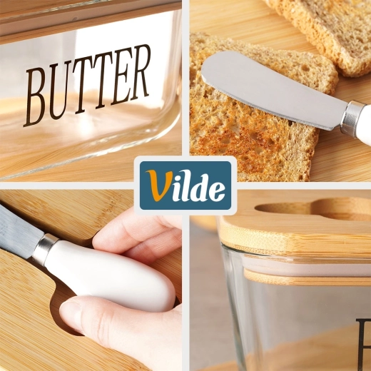 - Set complet: cutie pentru unt, capac din bambus și cuțitaș pentru întindere
