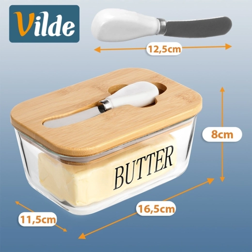 Volum 650 ml, dimensiuni 16,5 × 11,5 × 8 cm. Partea din sticlă este potrivită pentru mașina de spălat vase și pentru cuptorul cu microunde, pentru încălzirea rapidă a untului.