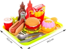 Set distractiv pentru micii bucătari, cu până la 26 de piese colorate pentru joc de tip fast food. Include tavă, hamburger, hot dog, cartofi prăjiți, wafer, băuturi și sosuri. Susține imaginația, motricitatea fină și jocul împreună cu părinții.
