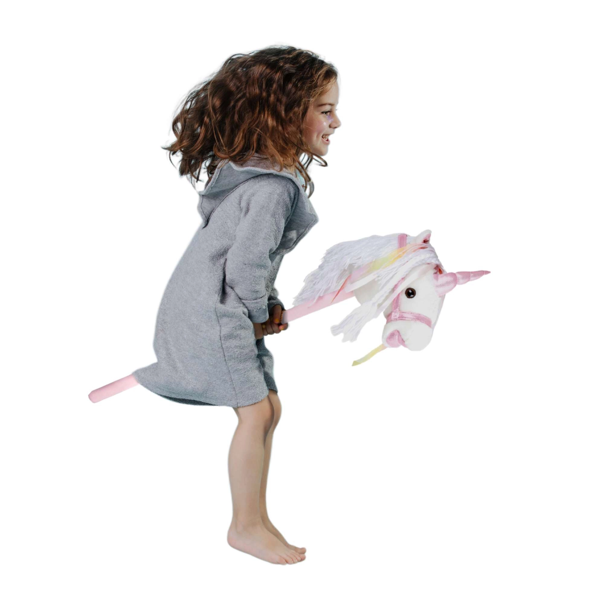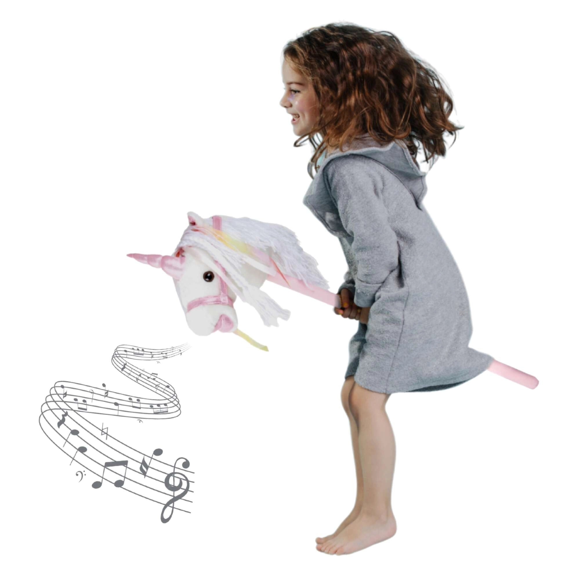 Acest unicorn pe băț susține mișcarea, imaginația și jocul de rol. Plușul fin este plăcut la atingere, iar coama decorativă și panglicile adaugă fiecărei călătorii o atmosferă magică. La apăsarea butonului din ureche se aud sunete realiste de trap și nechezat, care fac jocul de călărie și mai captivant pentru copii.