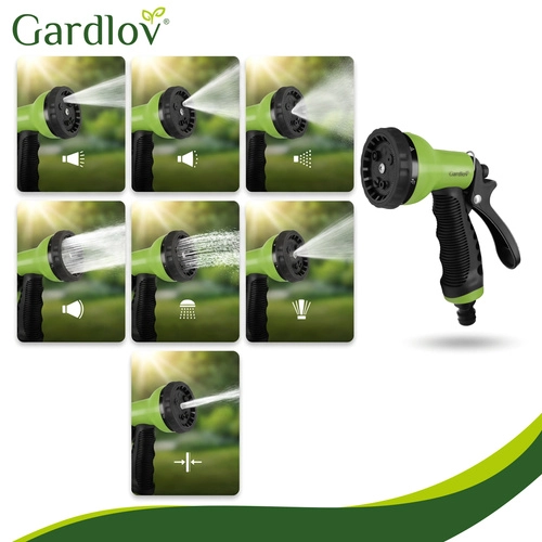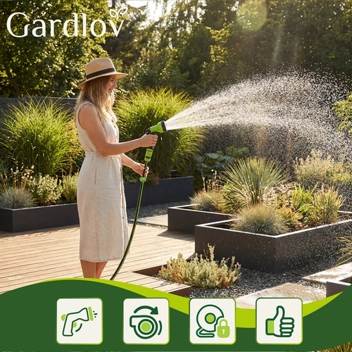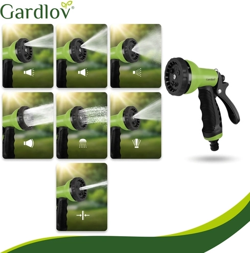 Pistolul multifuncțional oferă șapte tipuri de jet, de la ceață fină la jet puternic – ideal atât pentru plante fragile, cât și pentru spălarea teraselor și a uneltelor.