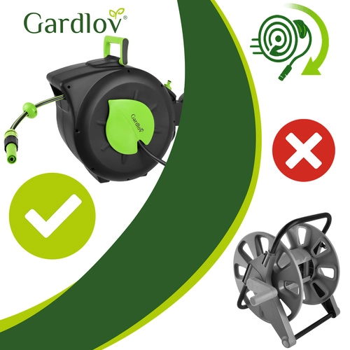 Soluție practică pentru orice grădină: mecanismul automat de înfășurare economisește timp, previne răsucirea și protejează furtunul. Datorită razei de 30 m, udați comod straturile îndepărtate fără reconectare, iar blocarea lungimii menține furtunul exact în poziția dorită.