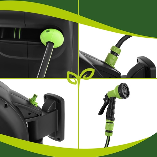 Suportul de perete cu articulație pivotantă la 180° permite mișcare lină în curte fără îndoituri. Pistolul de stropire cu 7 trepte oferă de la ceață fină la jet puternic pentru lucrări de curățenie. Compatibilitatea cu robineți 1/2" și 3/4" asigură conectare ușoară în instalațiile casnice obișnuite; funcționarea este stabilă la presiune de până la 6 bar.