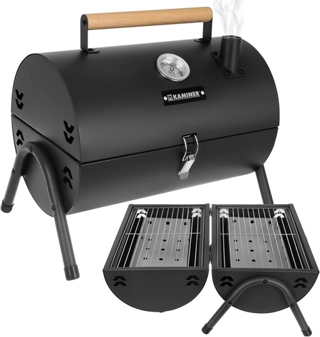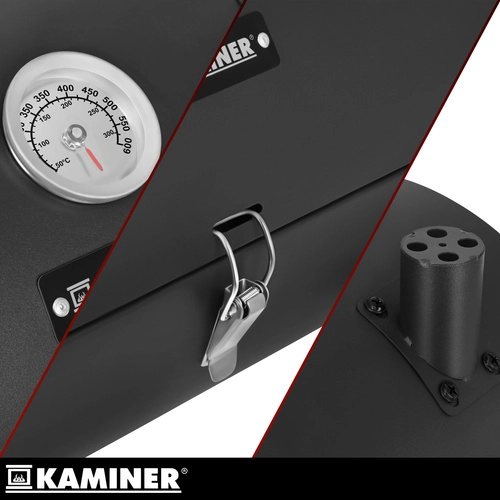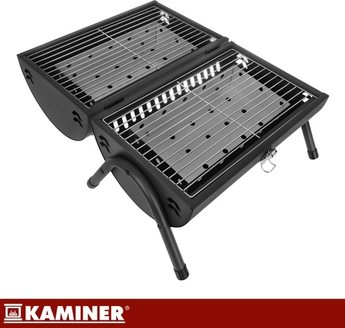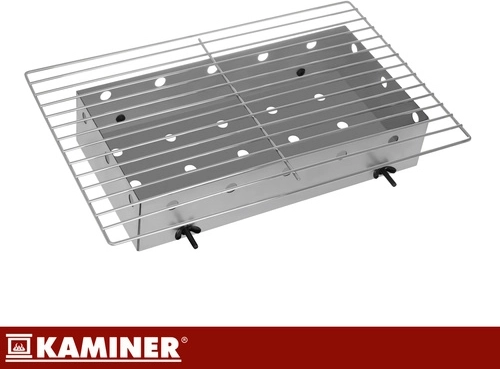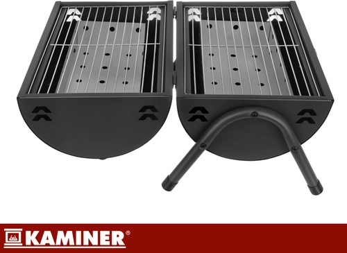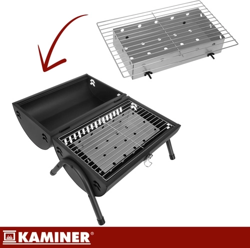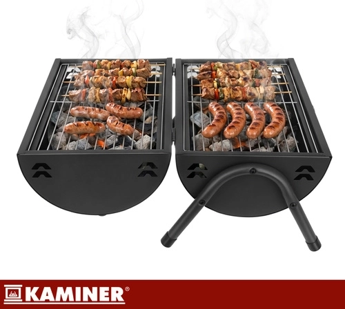 Bucurați-vă de grătar oriunde – în grădină, la cabană sau la picnic. Grătarul portabil KAMINER cu capac și termometru vă permite să controlați precis temperatura fără a ridica mereu capacul. Două grătare separate măresc suprafața de lucru și permit împărțirea zonelor pentru diferite tipuri de alimente. Cele două tăvițe pentru cărbuni distribuie căldura uniform și ușurează curățarea vetrei.