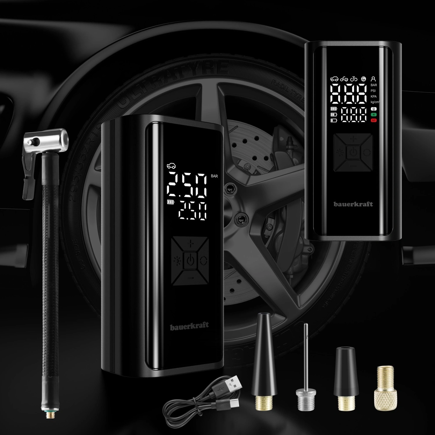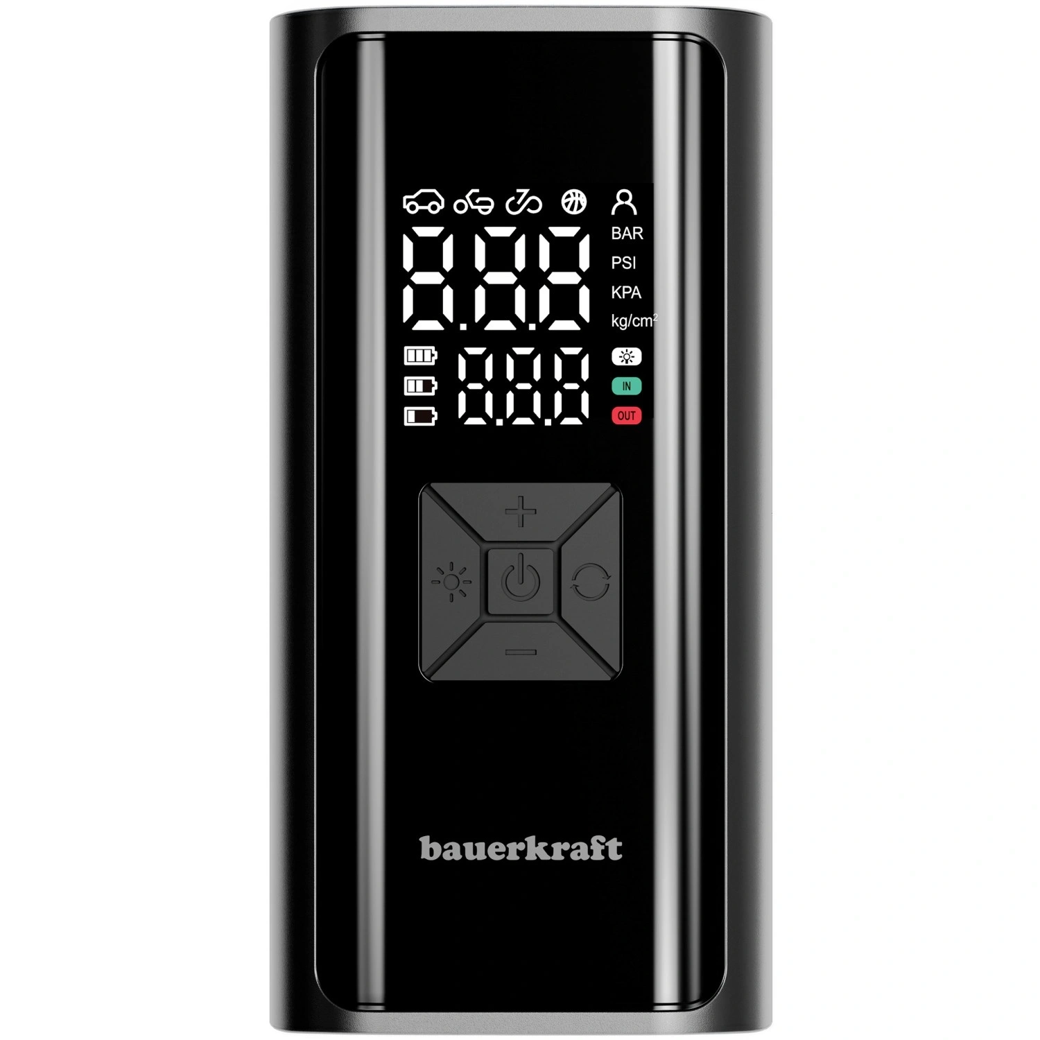 Urmăriți presiunea și nivelul bateriei în timp real. Setați valoarea țintă, iar compresorul se oprește automat la atingerea acesteia – în siguranță și fără supraumflare.
