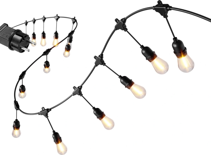 Ghirlanda de grădină elegantă conferă spațiului tău, după lăsarea serii, o notă plăcută și un luciu decorativ. Datorită luminii calde de 2700K, este ideală pentru zone de relaxare, pergole, foișoare și terase de restaurante. Rezistența IP44 asigură utilizare fiabilă în exterior chiar și pe vreme schimbătoare.