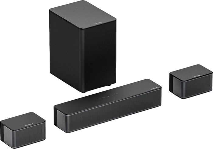 - soundbar, subwoofer wireless, 2× difuzoare spate cu cablu, adaptor de alimentare, cablu de alimentare pentru subwoofer, cablu HDMI, cablu optic, cablu stereo RCA–RCA (6 m), cablu 3,5 mm–RCA, set pentru montare pe perete, suporturi și șuruburi de montaj, telecomandă, ghid de utilizare