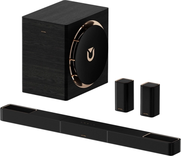 Transmisia wireless duală de 5 GHz stabilă minimizează interferențele și menține latența sub 20 ms între soundbar, subwoofer și boxele din spate. Conectarea prin HDMI eARC permite pass-through 4K HDR fără cablare complicată. Telecomanda IR îmbunătățită și aplicația Ultimea cu EQ pe 10 benzi, 21 de presetări și moduri Film / Muzică / Voce / Sport / Jocuri / Noapte vă oferă control complet asupra sunetului.