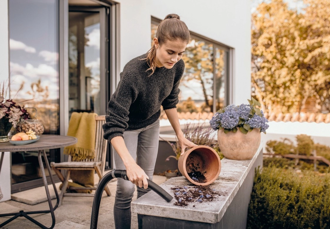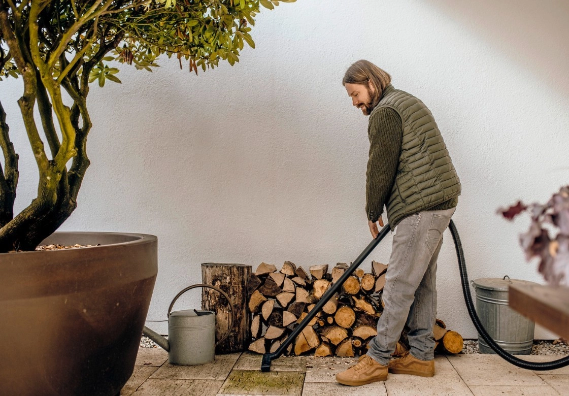 Datorită construcției compacte, cablului de alimentare de 4 m și furtunului de aspirare de 2 m, ajungeți oriunde aveți nevoie. Suporturile practice pentru accesorii, cârligul pentru cablu și posibilitatea de a agăța furtunul pe capul aparatului economisesc spațiu și păstrează totul la îndemână. Funcția de suflare ajută acolo unde nu se poate aspira – de exemplu frunze și murdărie din crăpături.