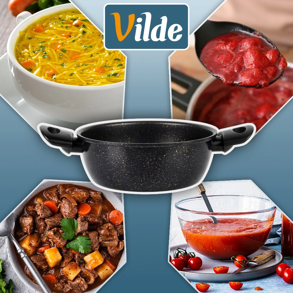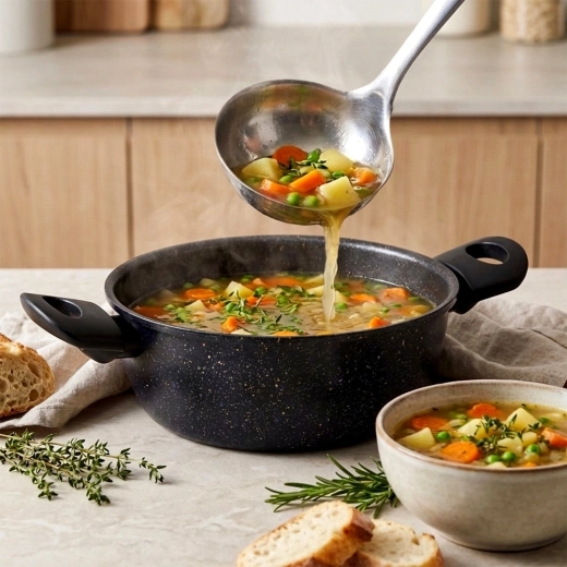 Oala universală din gama Basic Line este realizată din oțel carbon solid și prevăzută cu strat antiaderent din granit pentru răsturnarea ușoară a preparatelor și curățare rapidă. Ideală pentru gătit zilnic, înăbușire și încălzire a supelor, sosurilor, legumelor și felurilor principale.