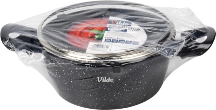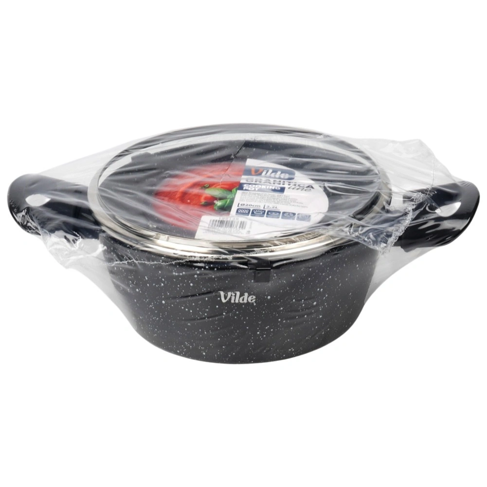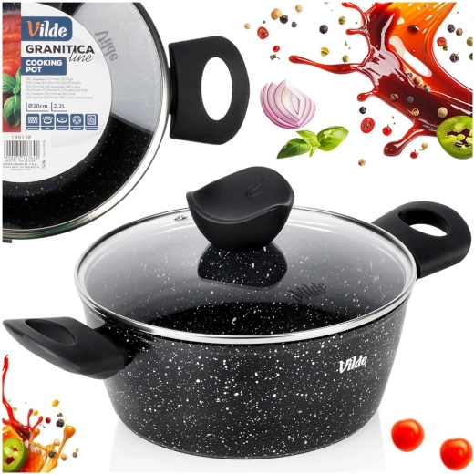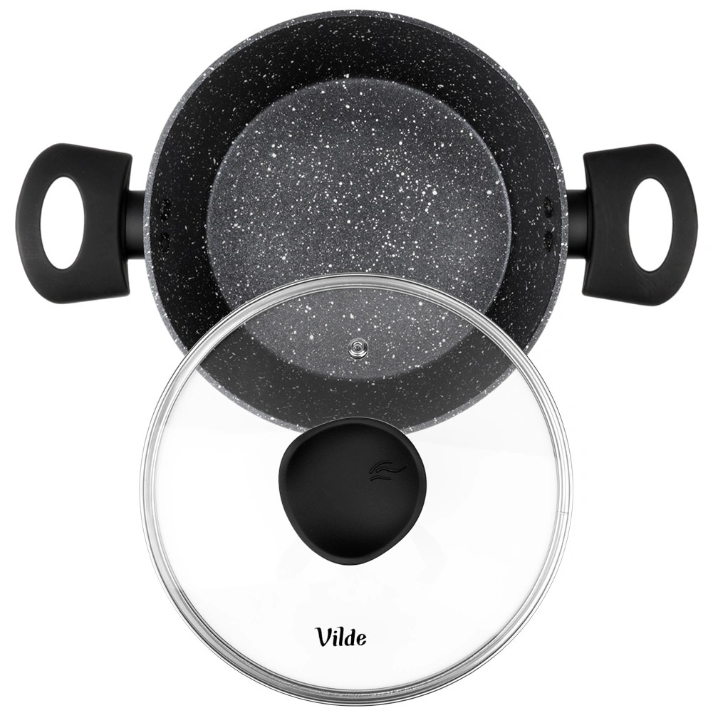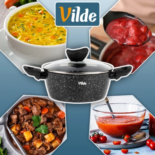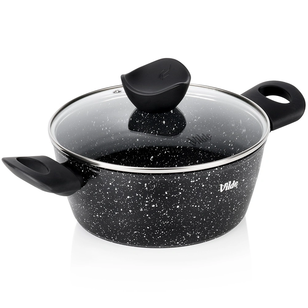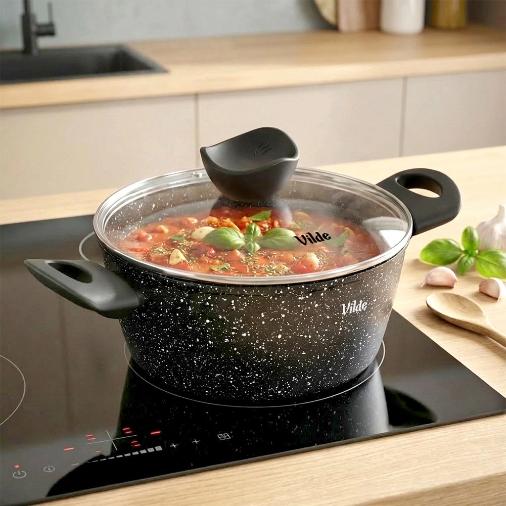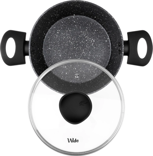 VILDE Granitica Line aduce o combinație de durabilitate și confort. Stratul antiaderent din granit previne lipirea, capacul de sticlă cu ventil de abur facilitează controlul gătirii, iar mânerele ergonomice cu finisaj soft touch sporesc siguranța și confortul la manipulare.