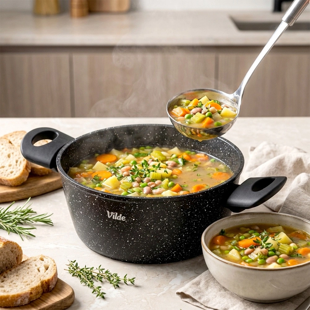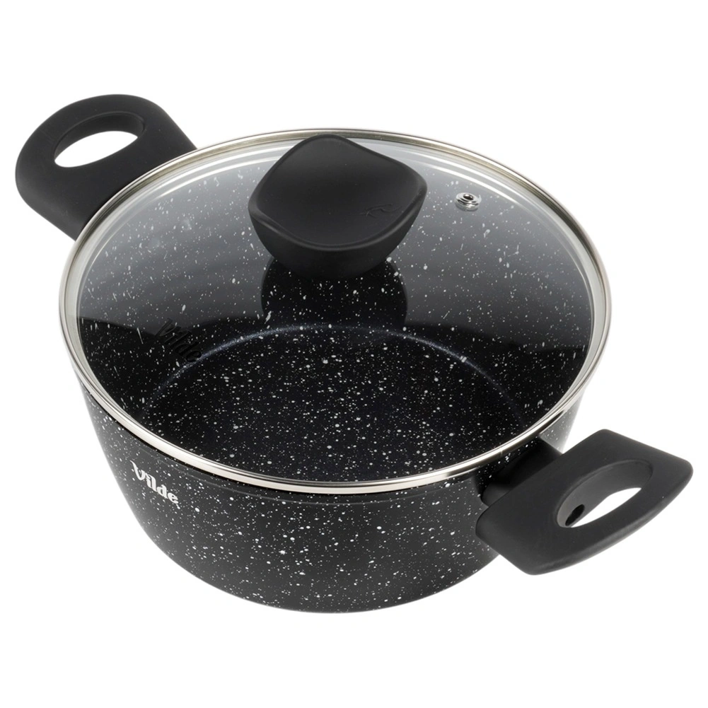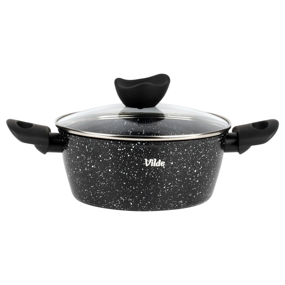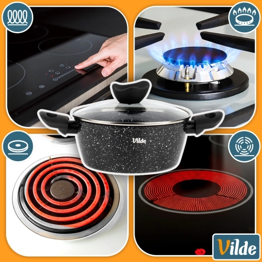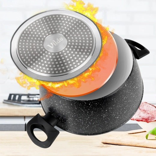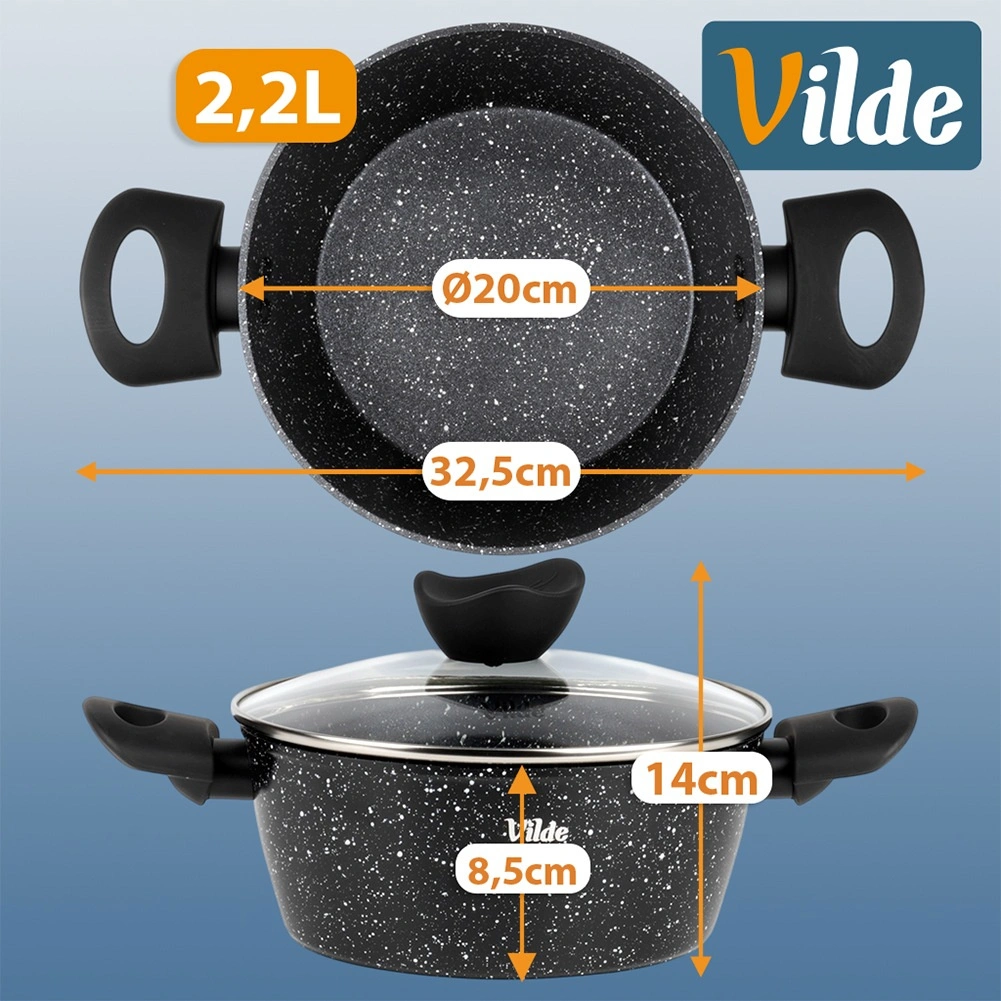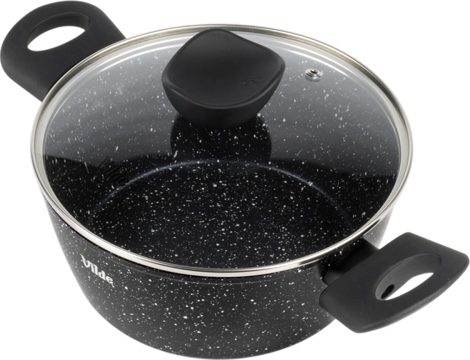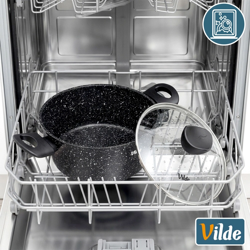 VILDE Granitica Line aduce o combinație de durabilitate și confort. Stratul antiaderent din granit previne lipirea, capacul de sticlă cu ventil de abur facilitează controlul gătirii, iar mânerele ergonomice cu finisaj soft touch sporesc siguranța și confortul la manipulare.