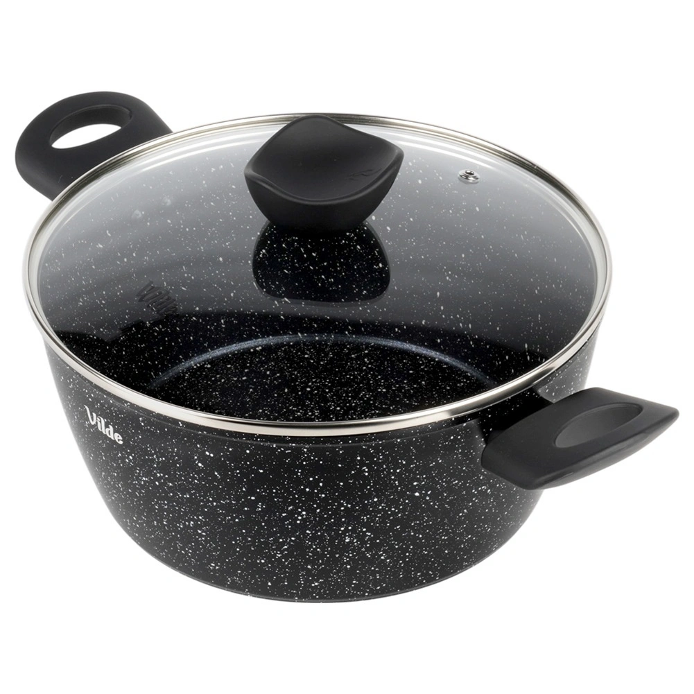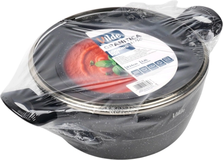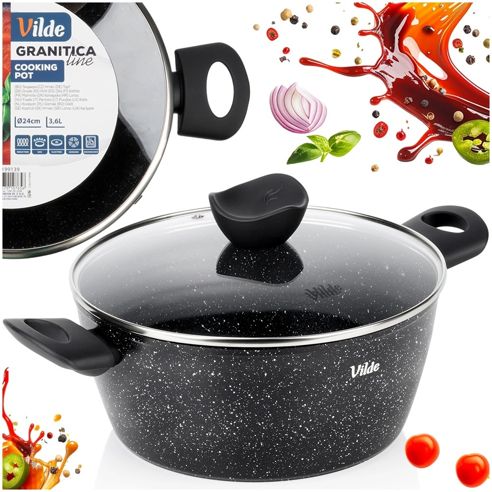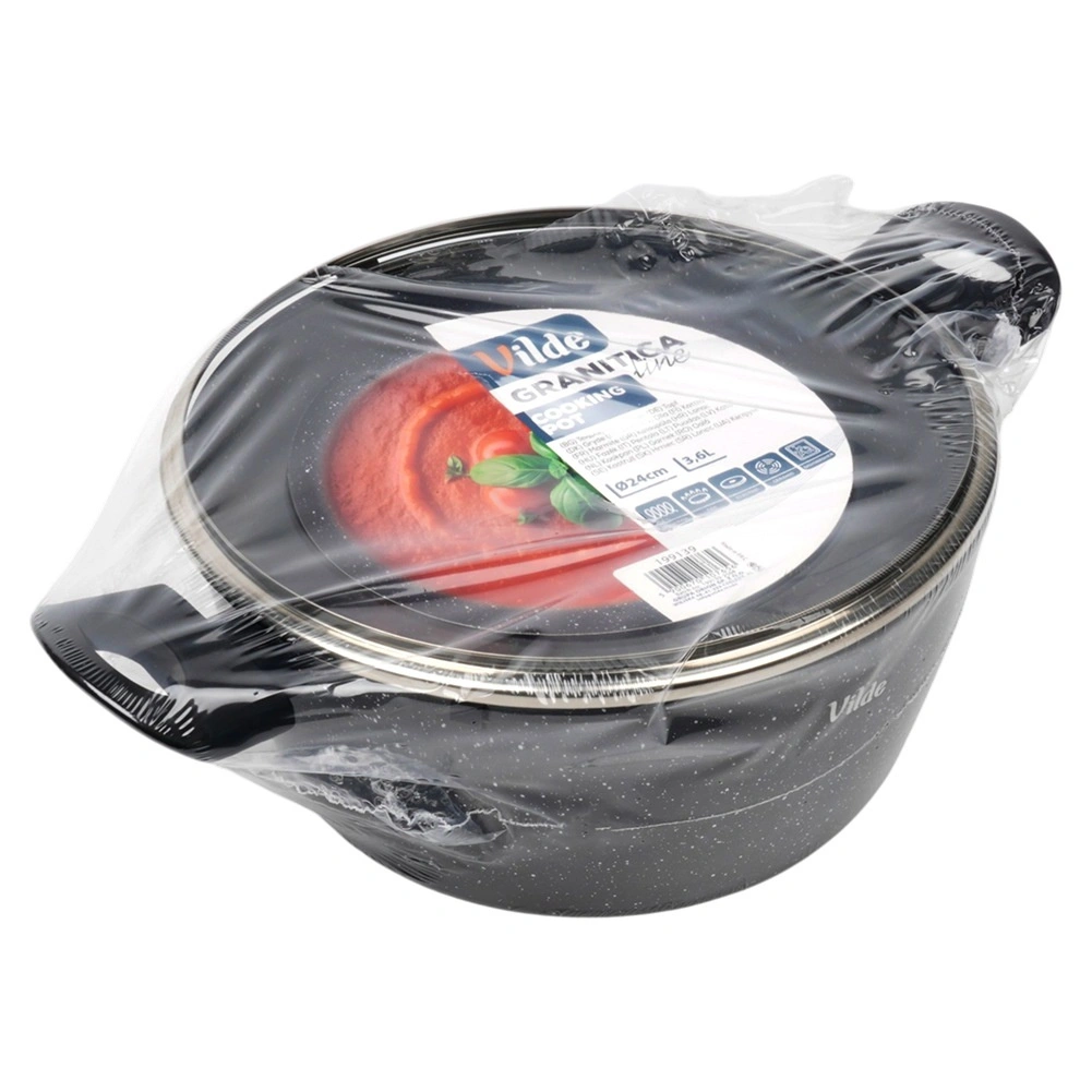Oală elegantă din granit cu diametrul de 24 cm și volumul de 3,6 l, ideală pentru gătitul zilnic al supelor, sosurilor și pentru înăbușire. Stratul antiaderent din granit în trei straturi asigură distribuție uniformă a căldurii și eliberarea ușoară a preparatelor fără ardere – pentru gătit mai gustos și mai sănătos, cu minimum de ulei.